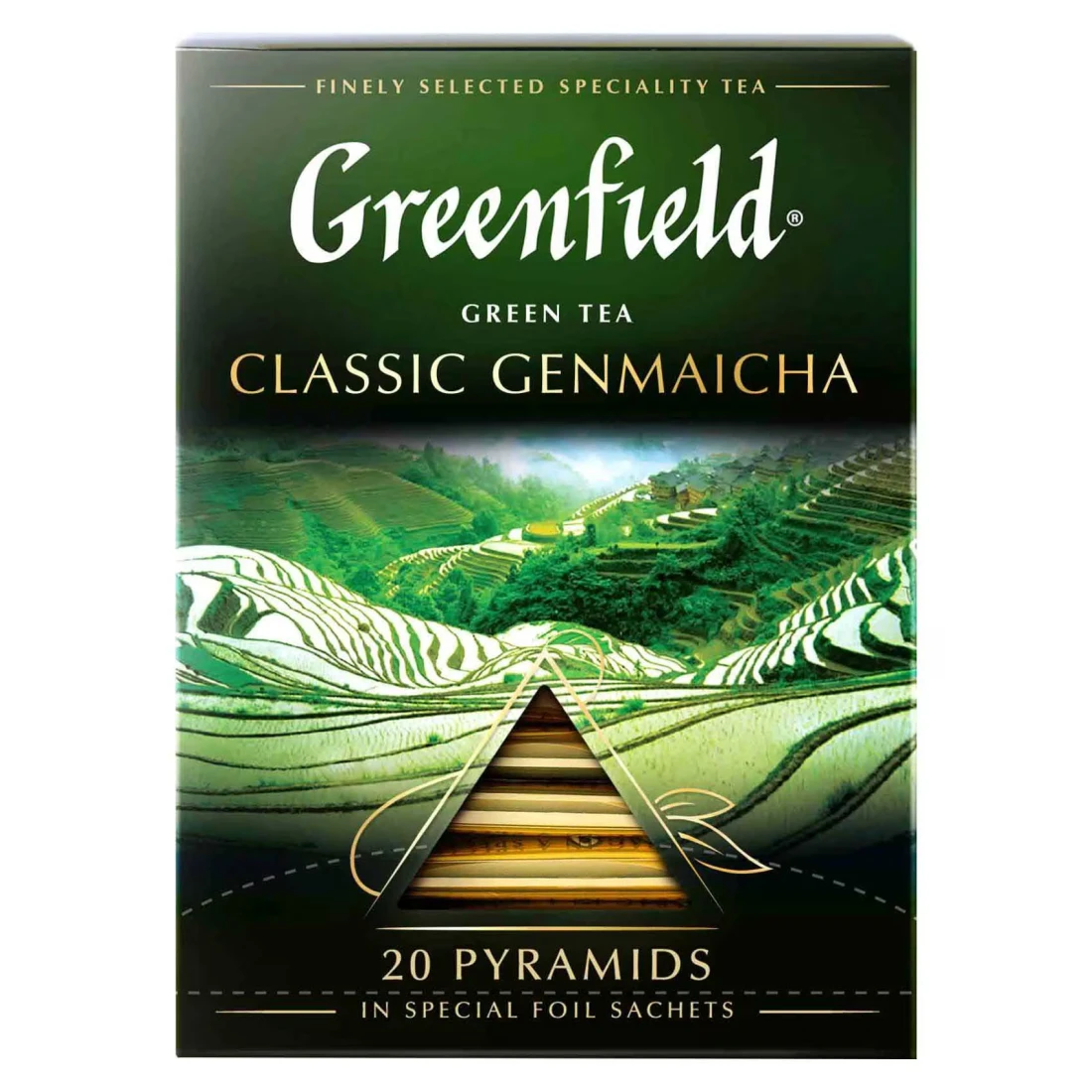 شاي جرين فيلد كلاسيك هو شاي ياباني مع حبات الأرز البني. لها مذاق جوزي ومريح للشرب مع رائحة خفية من حبات الأرز.