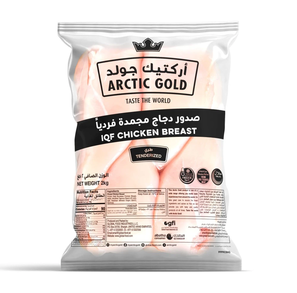 صدر دجاج مجمد عالي الجودة من أركتيك جولد، خالٍ من العظام والجلد. معبأ بتقنية التفريغ للحفاظ على النكهة والفوائد الغذائية. مثالي للشوي، الخبز، القلي أو أي وصفة صحية. سهل التخزين وسريع التحضير — يكفي فقط إذابته، تتبيله، ثم الاستمتاع بطعم طري وشهي.