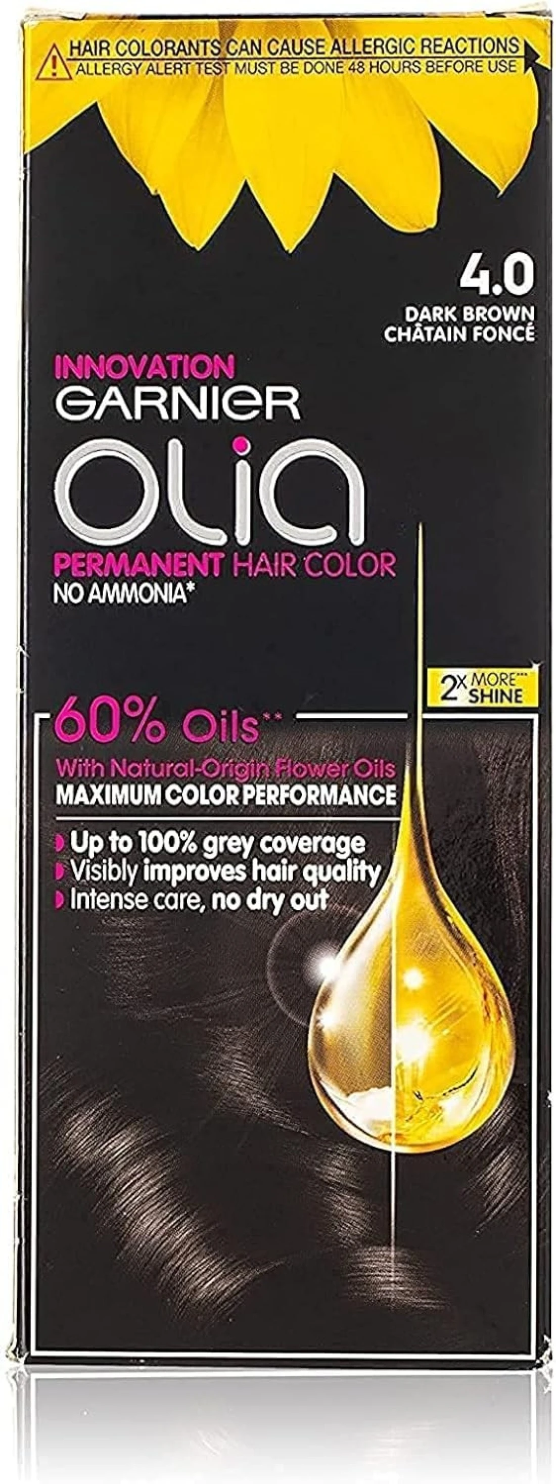 صبغة شعر اوليا من غارنييه، خالية من الامونيا، بزيوت بنسبة 60%، بدرجة لون 4.0 دارك براون