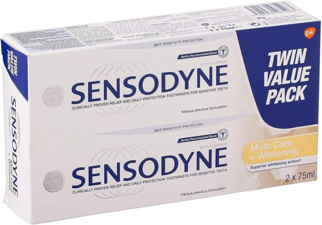 معجون اسنان سنسوداين متعدد العناية + تبييض للاسنان الحساسة، تاثير تبييض فائق، 75 مل، عبوة من قطعتين