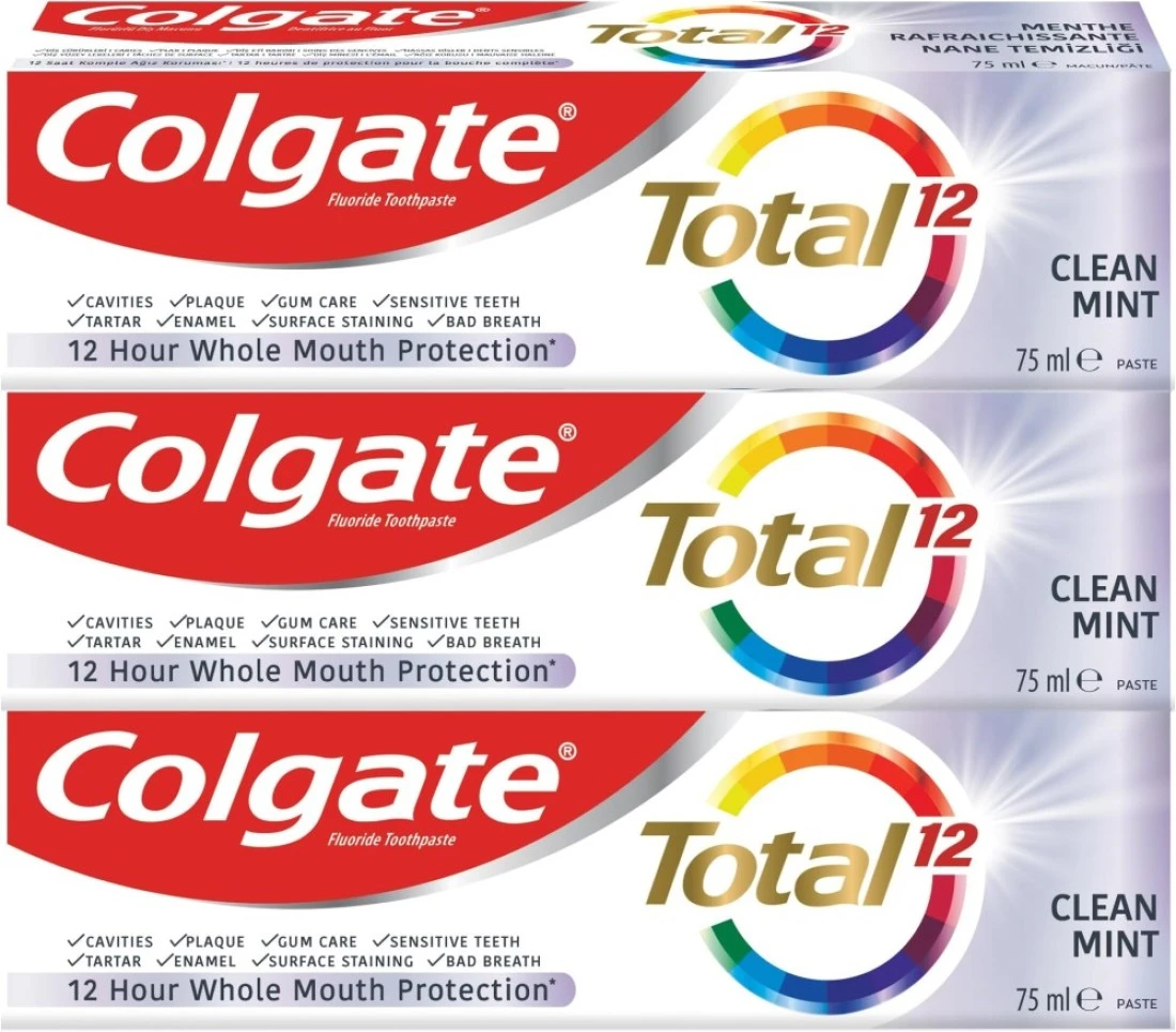 معجون اسنان توتال كلين بالنعناع من كولجيت للحماية لمدة 12 ساعة - 3 × 75 مل