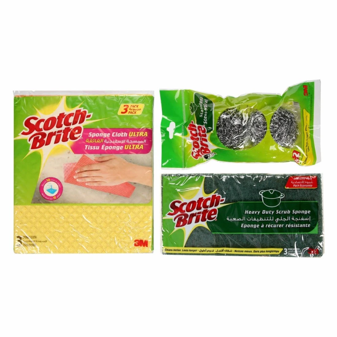 سكوتش برايت اسفنجة+ سلك التنظيف+ قطعة للتنظيق
