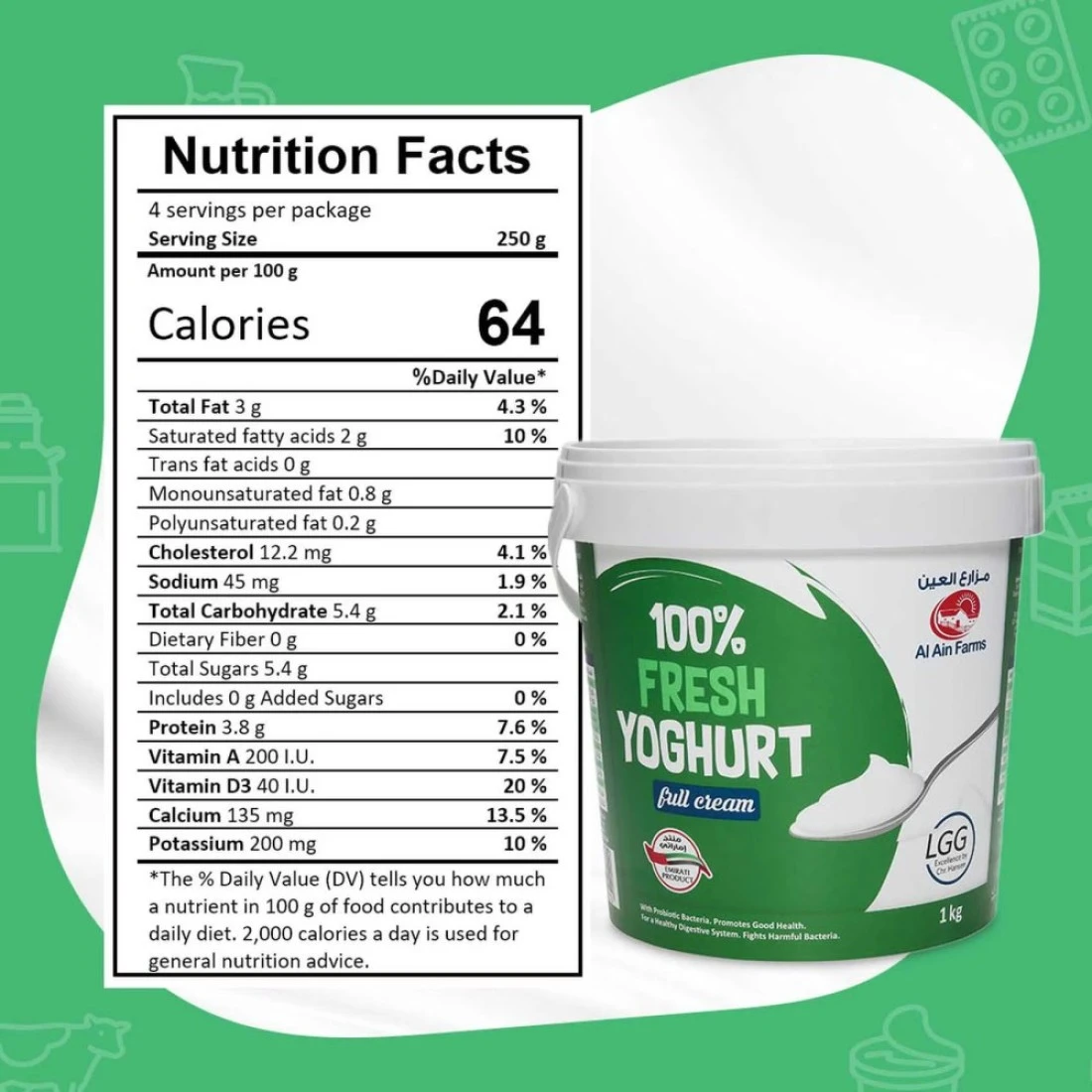 ingredients : حليب أبقار طازج كامل الدسم ، جوامد حليب ، زبادي مستنبت حي ، مثبت (إي 440 ، إي 471 ، إي 339) ، فيتامين أي ، فيتامين دي