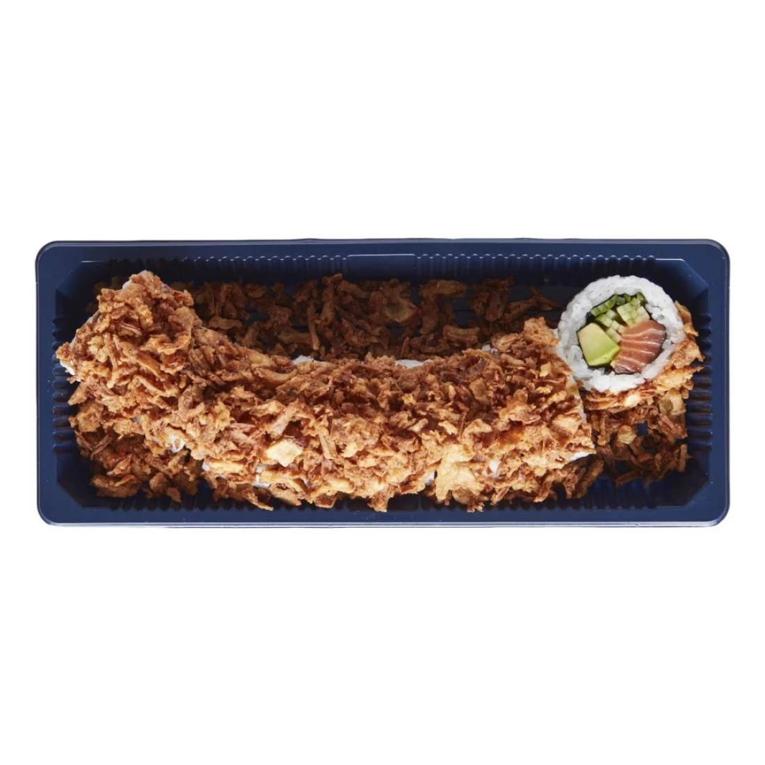 ingredients : أرز السوشي بالخل، سمك السلمون، البصل المقلي، الأفوكادو، الخيار، المايونيز الحار (المايونيز، سريراتشا)، صلصة السوشي وأعشاب البحر نوري.