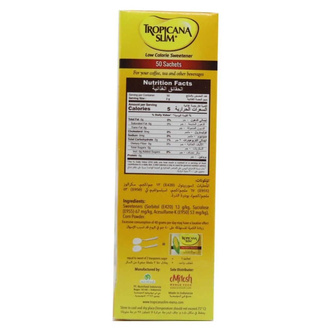 تروبيكانا سليم محلى منخفض السعرات الحرارية هو بديل للسكر يوفر نفس المذاق الحلو للسكر ولكن مع سعرات حرارية أقل بشكل ملحوظ. إنه مصنوع من مزيج من السكرالوز وسكر العنب مما يتيح للمستخدمين الإستمتاع بالأطعمة والمشروبات المفضلة لديهم دون القلق بشأن السعرات الحرارية الإضافية والآثار الصحية للسكر. حزمة من 100 غرام مثالية لأولئك الذين يرغبون في تقليل تناول السكر والحفاظ على نمط حياة صحي. يمكن إستخدام مُحلى تروبيكانا سليم منخفض السعرات الحرارية في الخبز، الطهي، القهوة والشاي، مما يجعله خيارًا متعدد الإستخدامات للأفراد الذين يتطلعون إلى تقليل إستهلاك السكر.
