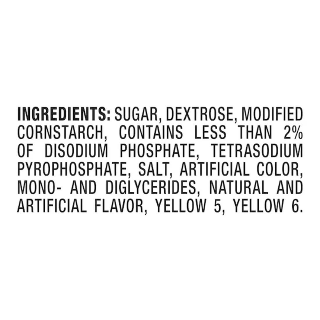 ingredients : سكر ، دكستروز ، نشا الذرة المعدل ، يحتوي على أقل من 2٪ من ثنائي فوسفات الصوديوم ، رباعي فوسفات البيروفوسفات الصوديوم ، ملح ، لون اصطناعي ، مونو وديجليسيريدات ، نكهة طبيعية واصطناعية ، اللون الأصفر 5 ، اللون الأصفر 6