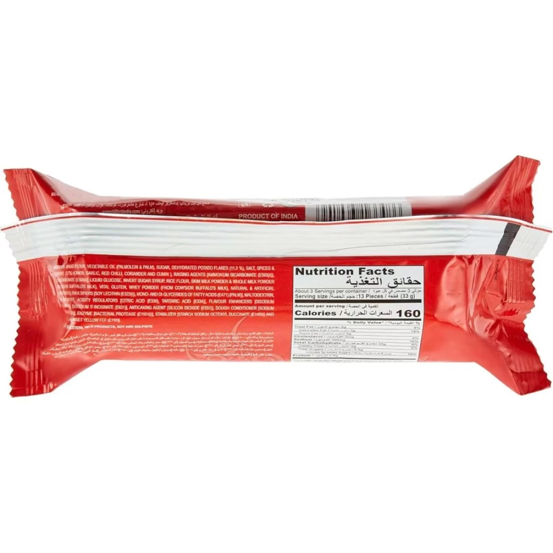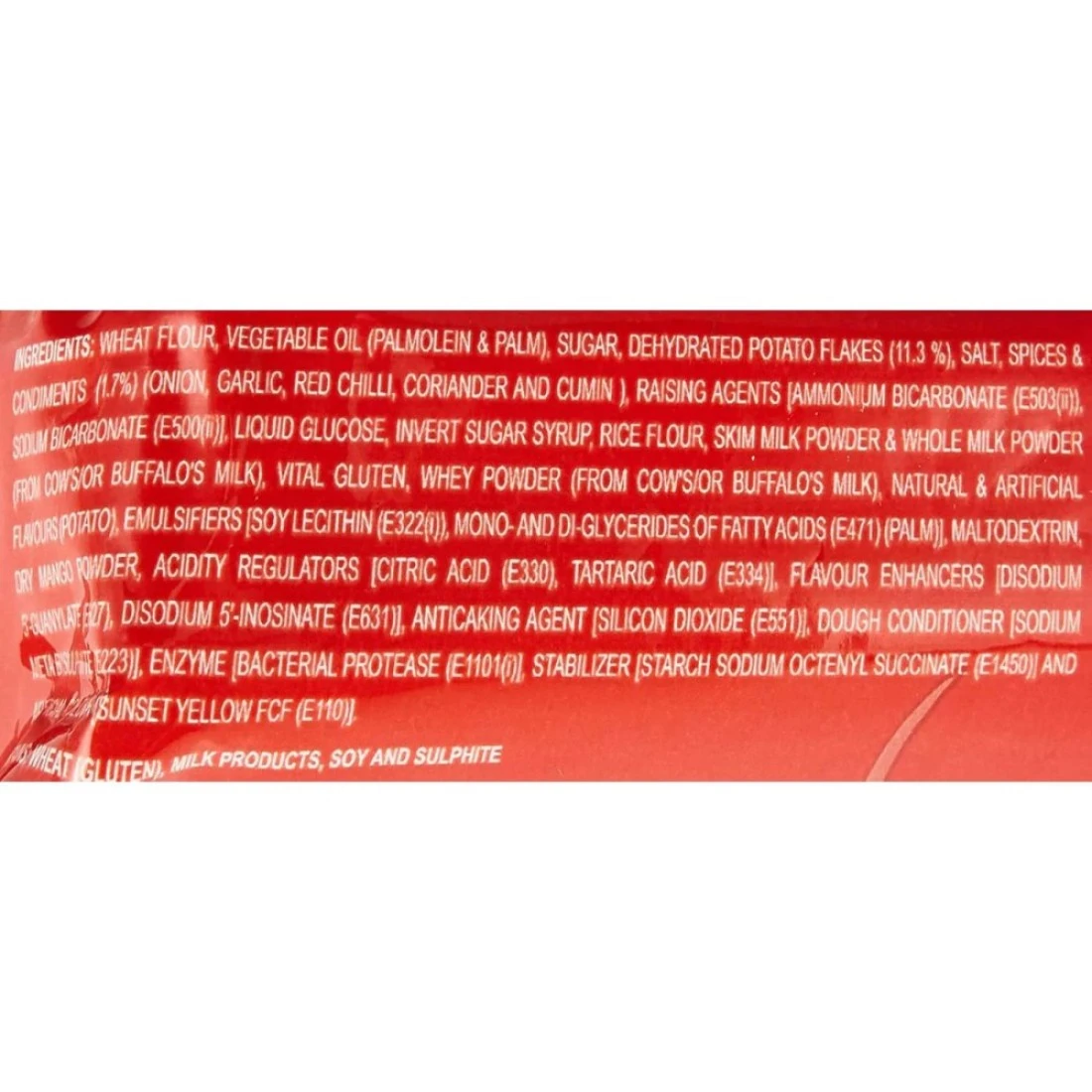 ingredients : دقيق القمح، زيت نباتي (نخيل)، سكر، رقائق البطاطس المجففة (11.3%)، ملح، توابل وبهارات (1.7%) (بصل، ثوم، فلفل أحمر، كزبرة وكمون)، مواد رافعة [بيكربونات الأمونيوم (E503) (2))، بيكربونات الصوديوم (E500 (ii)]، غلوكوز سائل، شراب السكر المحول، دقيق الأرز، مسحوق الحليب خالي الدسم ومسحوق الحليب كامل الدسم (من حليب البقر/أو الجاموس)، غلوتين حيوي، مسحوق مصل اللبن (من حليب البقر/أو الجاموس) حليب جاموس)، نكهات طبيعية وصناعية (بطاطس)، مستحلبات [ليسيثين الصويا (E322 (i)) ، غلسريدات أحادية وثنائية من الأحماض الدهنية (E471) (نخيل)]، مالتوديكسترين، مسحوق المانغو الجاف، منظمات الحموضة [حمضيات] حمض (E330)، حمض الطرطريك (E334)]، معززات النكهة [ثنائي الصوديوم 5'-غوانيلات (E627)، ثنائي الصوديوم 5'-إينوسينات (E631)]، عامل مضاد للتكتل [ثاني أكسيد السيليكون (E551)]، مكيف العجين [بيروكبريتيت الصوديوم (E223)]، إنزيم [بروتياز بكتيري (E1101 (i)]، مثبت [نشاء صوديوم أوكتينيل سكسينات (E1450)]