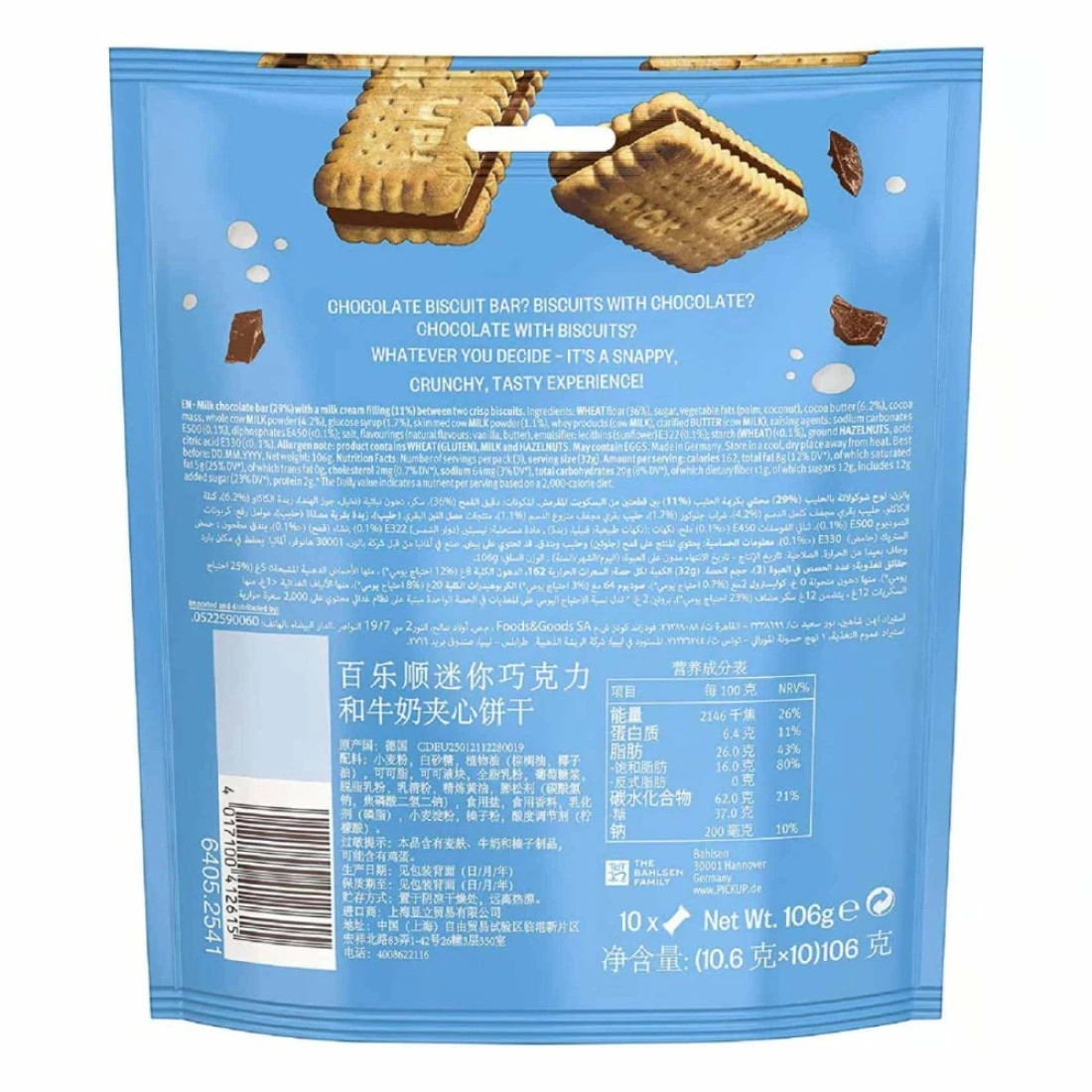 يعتبر بسكويت بيك أب! مينيز الشوكولاته و الحليب من بالسن مزيج من شريط شوكولاته حقيقي موضوع بين طبقتين من البسكويت اللذيد من ليبنيز. صغيرة الحجم ولكنها تحمل نكهة قوية، إنها ميزة شائعة في حقيبة الغداء لدى الأطفال! هذه البسكويتات المحشوة مثالية أيضًا كوجبة خفيفة سريعة أثناء التنقل في أي وقت من اليوم لتغميسها في كوب من الحليب أو الشاي أو تناولها مع القهوة. من الحرفية الرفيعة إلى التوازن الدقيق للمكونات اللذيذة، لن تخيب وجبات بالسن آمالك أبدًا. لا تحتوي على مواد حافظة، أو ألوان اصطناعية، أو نكهات اصطناعية، أو كائنات معدلة وراثياً. توقع فقط أن تكون سعيدًا ومستمتعًا!
