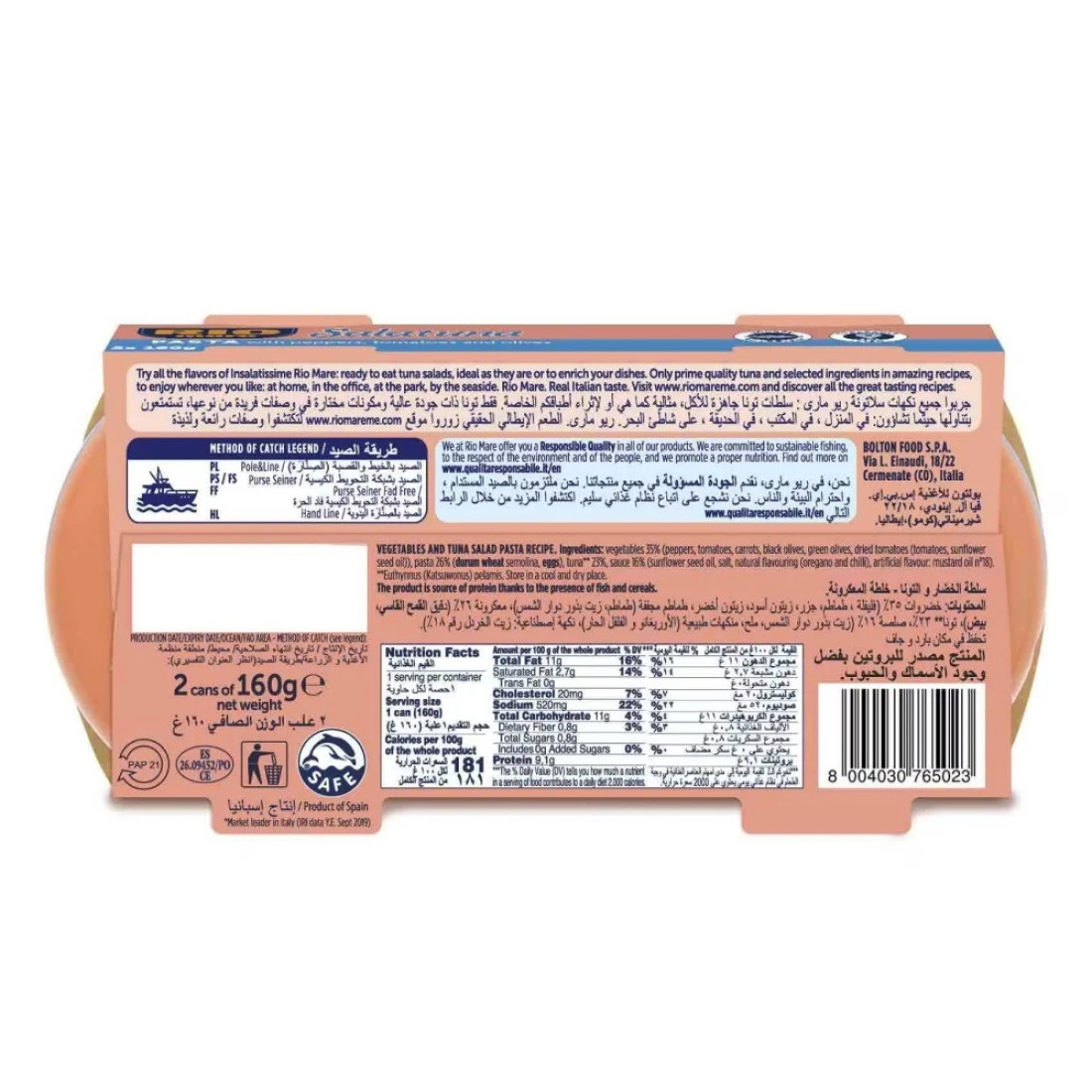 ريو ماري سلاتونة بالمعكرونة مع الفلفل والطماطم والزيتون هي خيار وجبة لذيذ ومريح. تحتوي كل حزمة على 2 وجبات بحجم 160 غرام من سلطة المعكرونة المصنوعة من مكونات عالية الجودة. يتم خلط المعكرونة مع الفلفل البارد الملون والطماطم والزيتون اللذيذ لإنشاء طبق منعش ومشبع. إنها مثالية لتناول غداء سريع أو عشاء خفيف وتوفر توازنًا بين الكربوهيدرات والبروتين والخضروات. بفضل تغليفها المريح، فهي مثالية أيضًا لأثناء التنقل أو للنزهات والأنشطة الخارجية. إستمتع بطعم إيطاليا مع ريو ماري سلاتونة بالمعكرونة مع الفلفل والطماطم والزيتون.