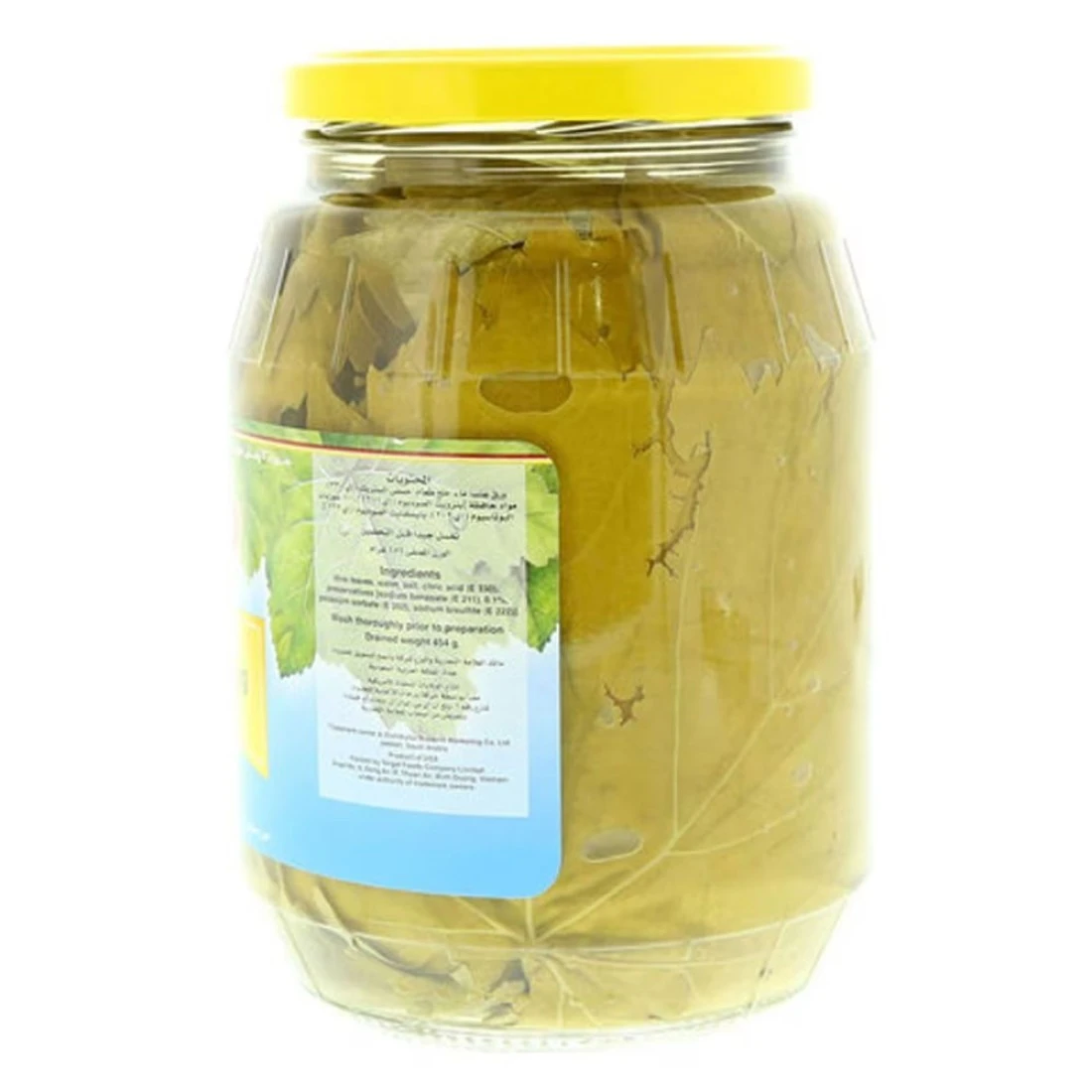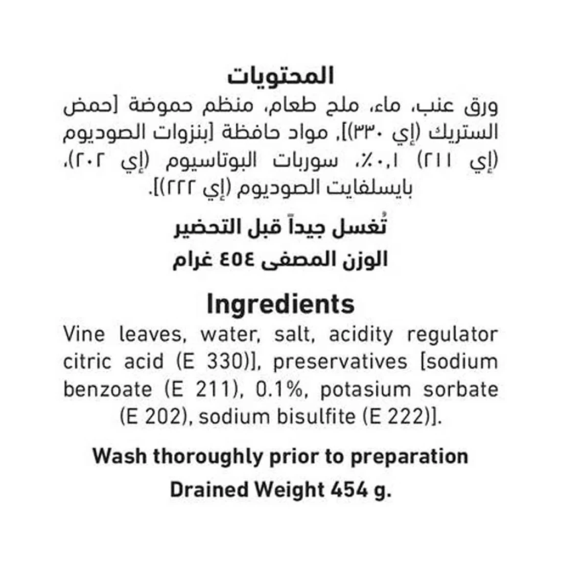ingredients : أوراق العنب، ماء، ملح، حمض الستريك (E330)، مواد حافظة [بنزوات الصوديوم (E211)، سوربات البوتاسيوم (E202) بنسبة 0.1%، ثنائي بيسلفيت الصوديوم (E222)].