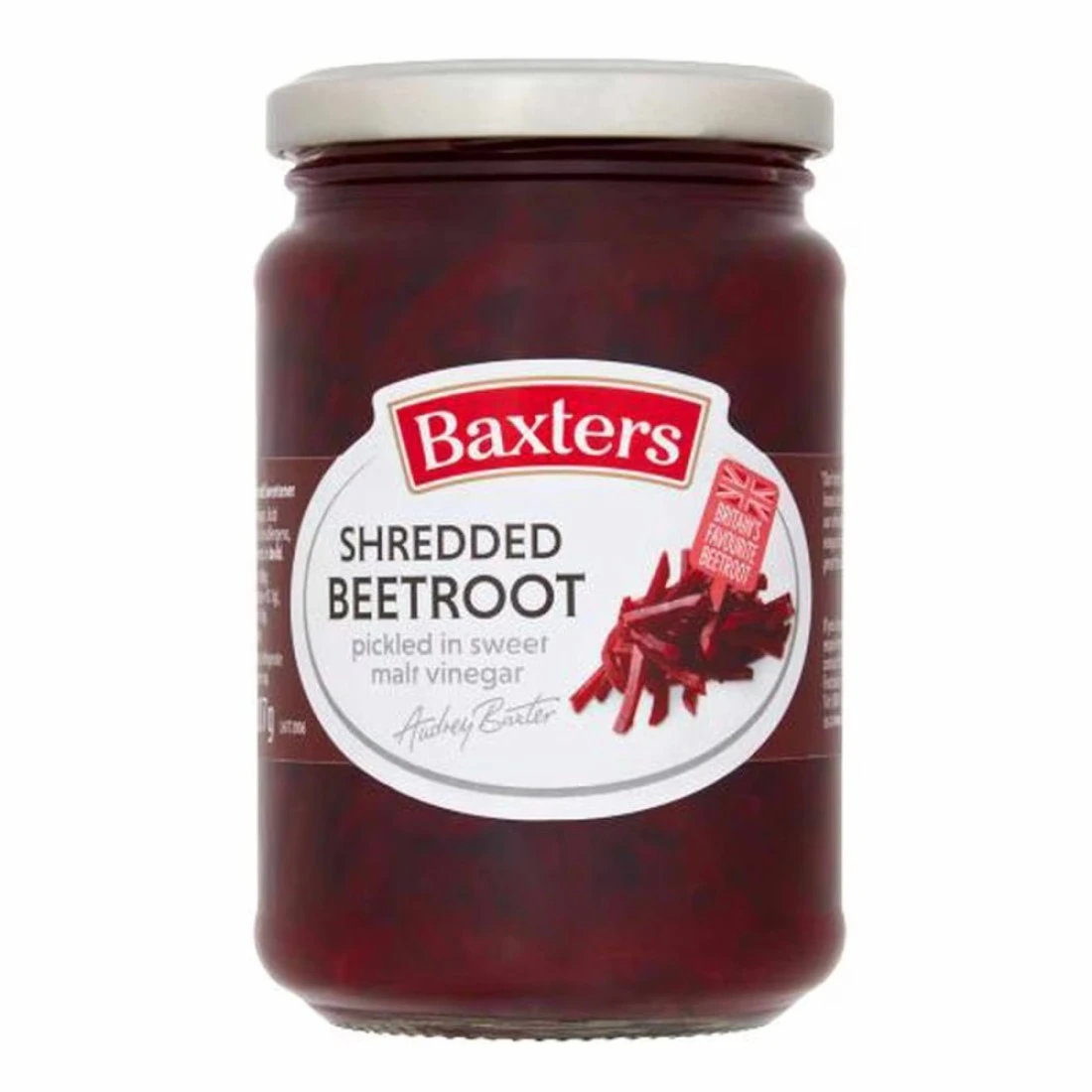 مخلل الشمندر المبشور في خل الشعير الحلو من باكسترز هو مكمل لذيذ وحامض مصنوع من الشمندر المبشور ومخلل في خل الشعير الحلو. الشمندر مطهو بشكل مثالي ومبشور ليعطي نكهة مقرمشة، ويضاف إليه خل الشعير الحلو ليمنحه نكهة حامضة لذيذة. هذا المخلل المتعدد الإستخدامات يمكن استخدامه كوجبة فوق البرغر أو السلطات أو السندويشات، أو تقديمه كطبق جانبي مع لحوم باردة وأنواع الجبن. إنه يضيف لمسة من اللون والنكهة لأي طبق وهو ضروري لعشاق المخللات.