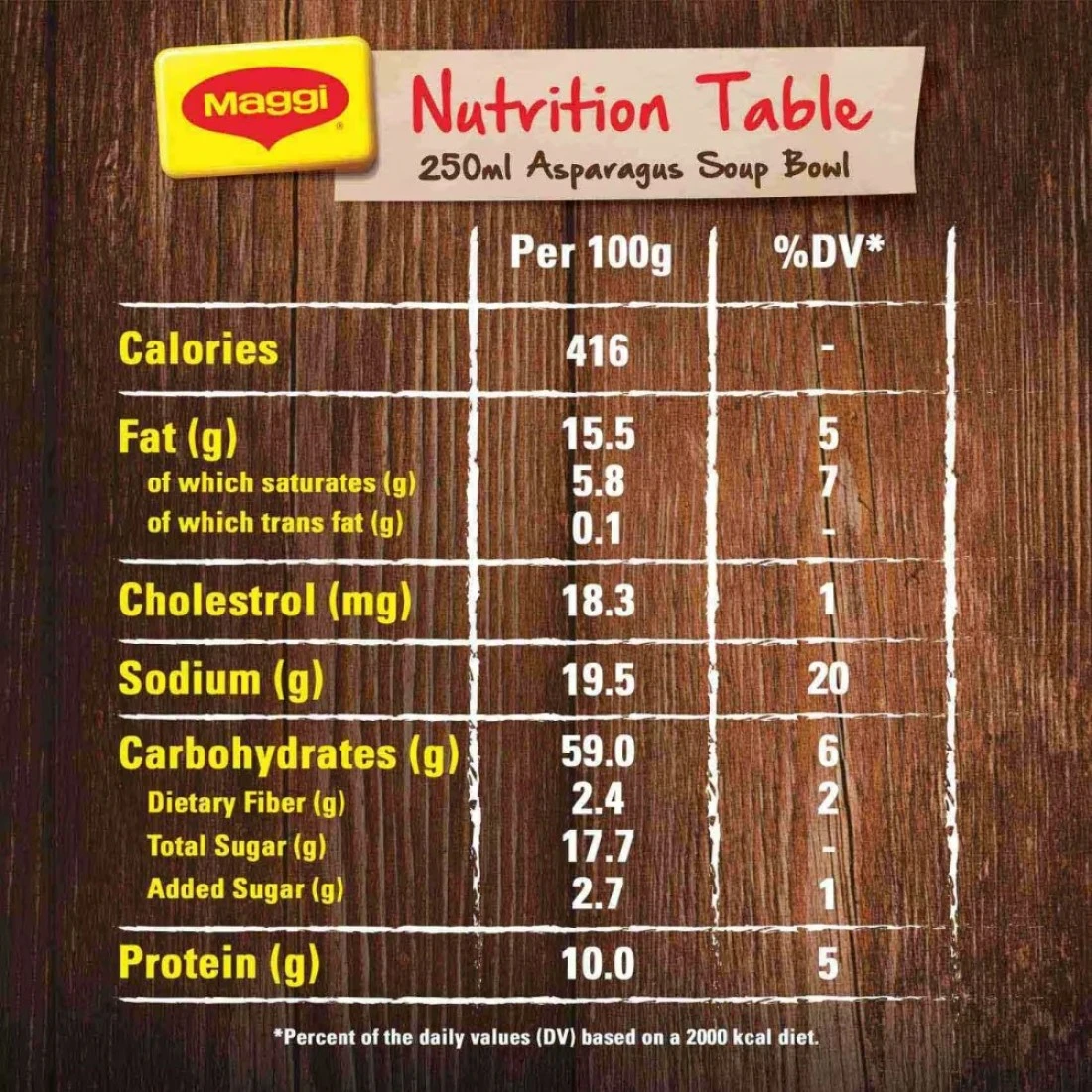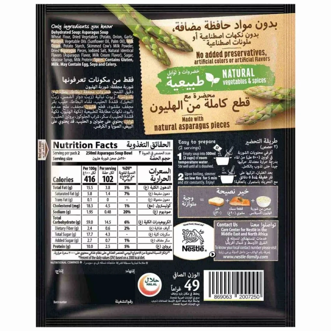 ingredients : دقيق القمح، خضراوات مجففة (بطاطس، بصل، ثوم، بقدونس)، زيوت نباتية (زيت عباد الشمس، زيت النخيل)، كريمة الحليب، نشا البطاطس، مسحوق حليب البقر منزوع الدسم، قطع الهليون المجففة، ملح اليود، نكهات طبيعية متطابقة (نكهة الهليون، نكهة كريمة الحليب)، سكر، شراب الجلوكوز، بروتين الحليب، توابل