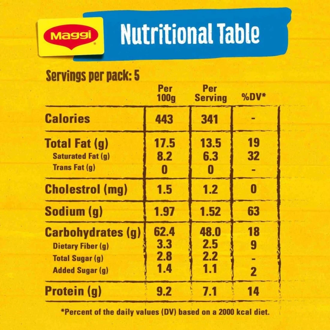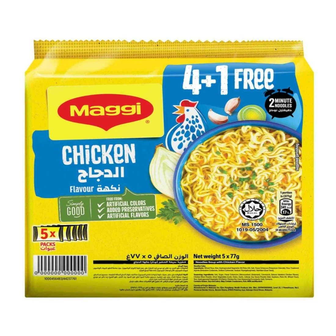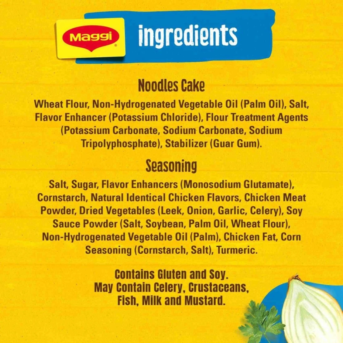 ingredients : كعكة المعكرونة: دقيق القمح، زيت النخيل، الملح، معزز النكهة (كلوريد البوتاسيوم)، مادة مثخنة (صمغ الغوار)، عوامل معالجة الدقيق (ثلاثي فوسفات الصوديوم، كربونات البوتاسيوم، كربونات الصوديوم). التتبيل: نشا الذرة، الملح، السكر، نكهة طبيعية مطابقة للدجاج، دهن النخيل، أحادي غلوتامات الصوديوم، مسحوق صلصة الصويا، نكهة لذيذة، رقائق الكراث، مسحوق البصل، مسحوق الثوم، ريبونوكليوتيد، بذور الكرفس، حمض الستريك، مسحوق الكركم