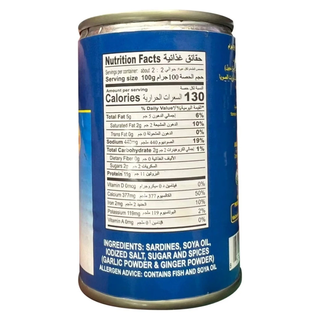 ingredients : سردين، زيت الصويا، ملح المعالج باليود، سكر وبهارات (بودرة الثوم وبودرة الزنجبيل)