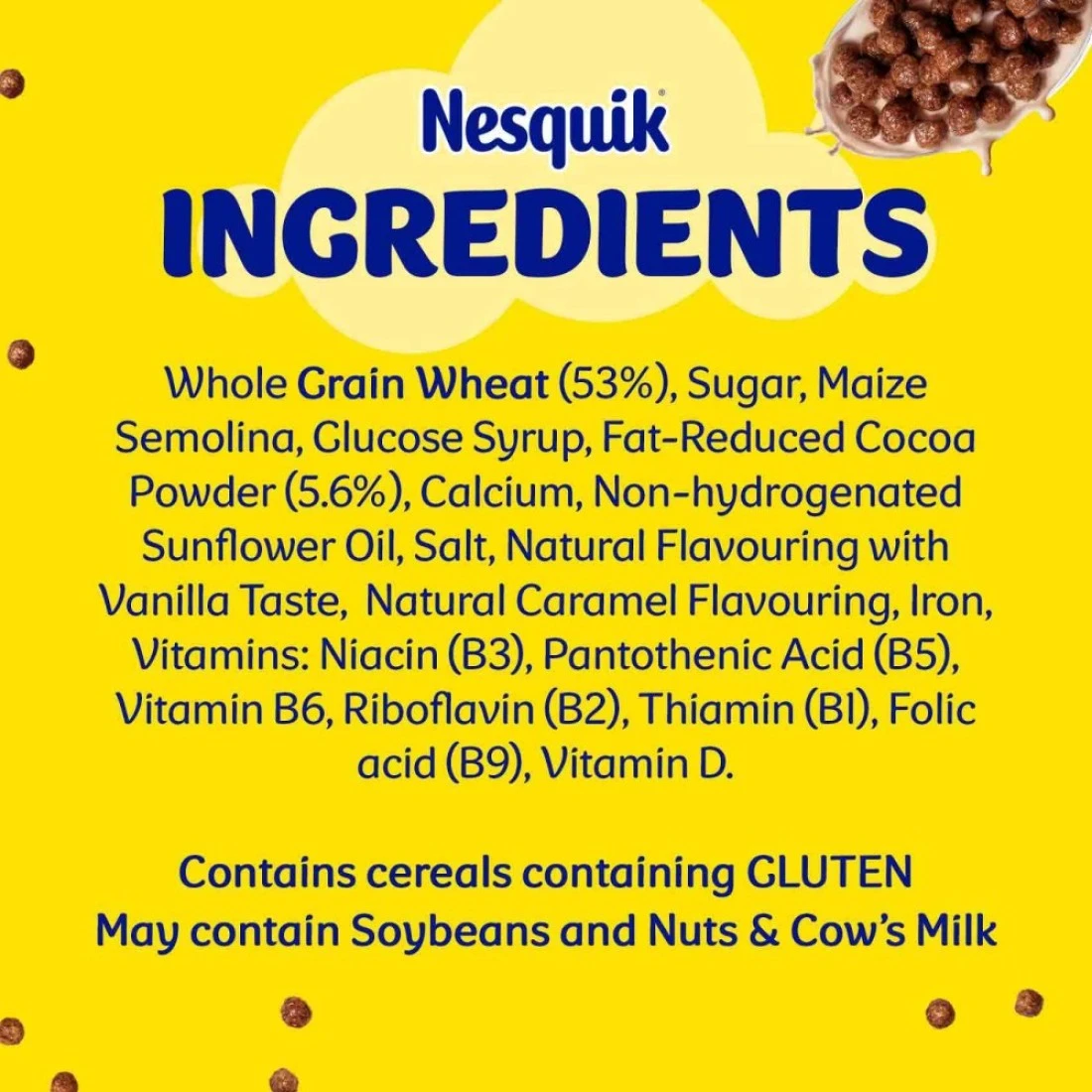 ingredients : دقيق قمح كامل الحبة (53%)، سكر، سميد الذرة، شراب الجلوكوز، مسحوق الكاكاو قليل الدسم (5.6%)، كالسيوم، زيت نباتي غير مهدرج (عباد الشمس)، ملح، نكهة طبيعية بنكهة الفانيليا، حديد، فيتامينات: نياسين (ب3)، حمض البانتوثينيك (ب5)، فيتامين ب6، ريبوفلافين (ب2)، ثيامين (ب1)، حمض الفوليك (ب9)، فيتامين د