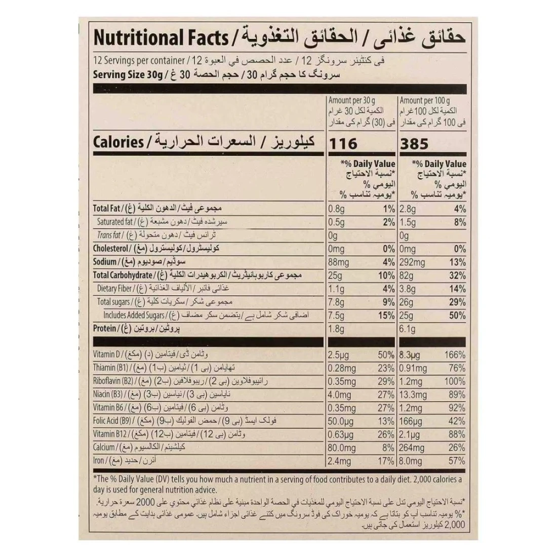 ingredients : طحين الذرة، سكر، شراب الغلوكوز، مسحوق الكاكاو (3%)، مسحوق الكاكاو قليل الدسم (2.5%)، كتلة الكاكاو، ملح، عامل رفع (كربونات هيدروجين الصوديوم)، نكهة طبيعية (شوكولاته)