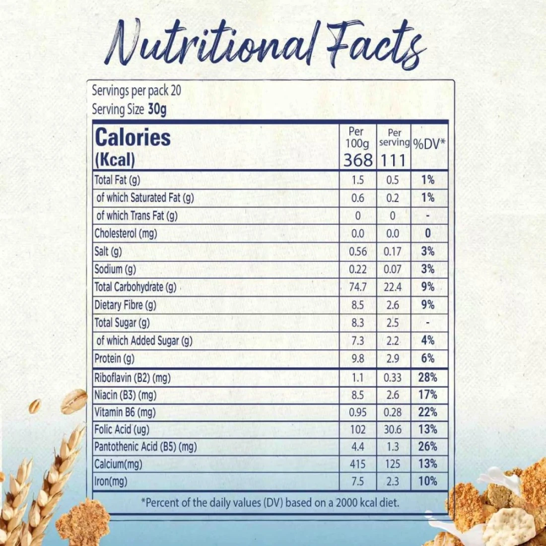 ingredients : قمح كامل الحبة، أرز، سكر، رقائق شوفان كاملة الحبة، شراب السكر المحول، دبس السكر، مستخلص الشعير، ملح، شراب الجلوكوز، مضادات الأكسدة، توكوفيرول، معادن، كالسيوم وحديد، فيتامينات ب3، ب5، ب2، ب6، ب9