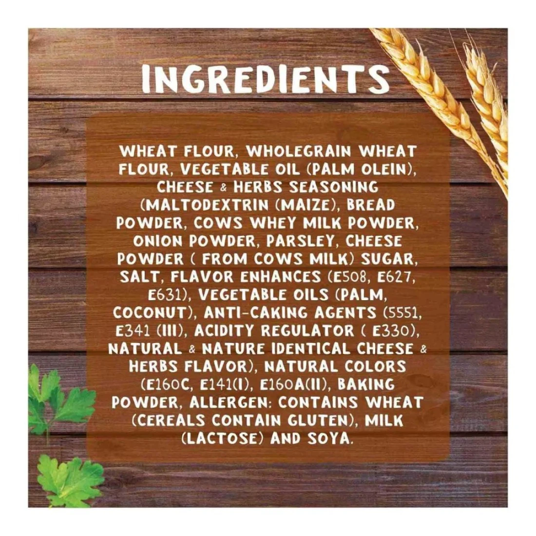 ingredients : دقيق قمح ، دقيق قمح كامل ، زيوت نباتية ، نخيل أولين ، عباد شمس ، جبن وأعشاب توابل متوديكسترين ، مسحوق خبز ذرة ، مصل لبن، مسحوق حليب بقر ، مسحوق بصل ، بقدونس ، مسحوق جبن من حليب بقر ،سكر ، محسنات نكهة ملح إي 508 إي 627 إي 631 زيوت نباتية نخيل ، جوز هند عامل، مضاد للتكتل إي 551 إي 341 إي منظم حموضة إي 330 طبيعي متطابق نكهة جبن وأعشاب ، ألوان طبيعية إي 160 سي إي 141 إي 160