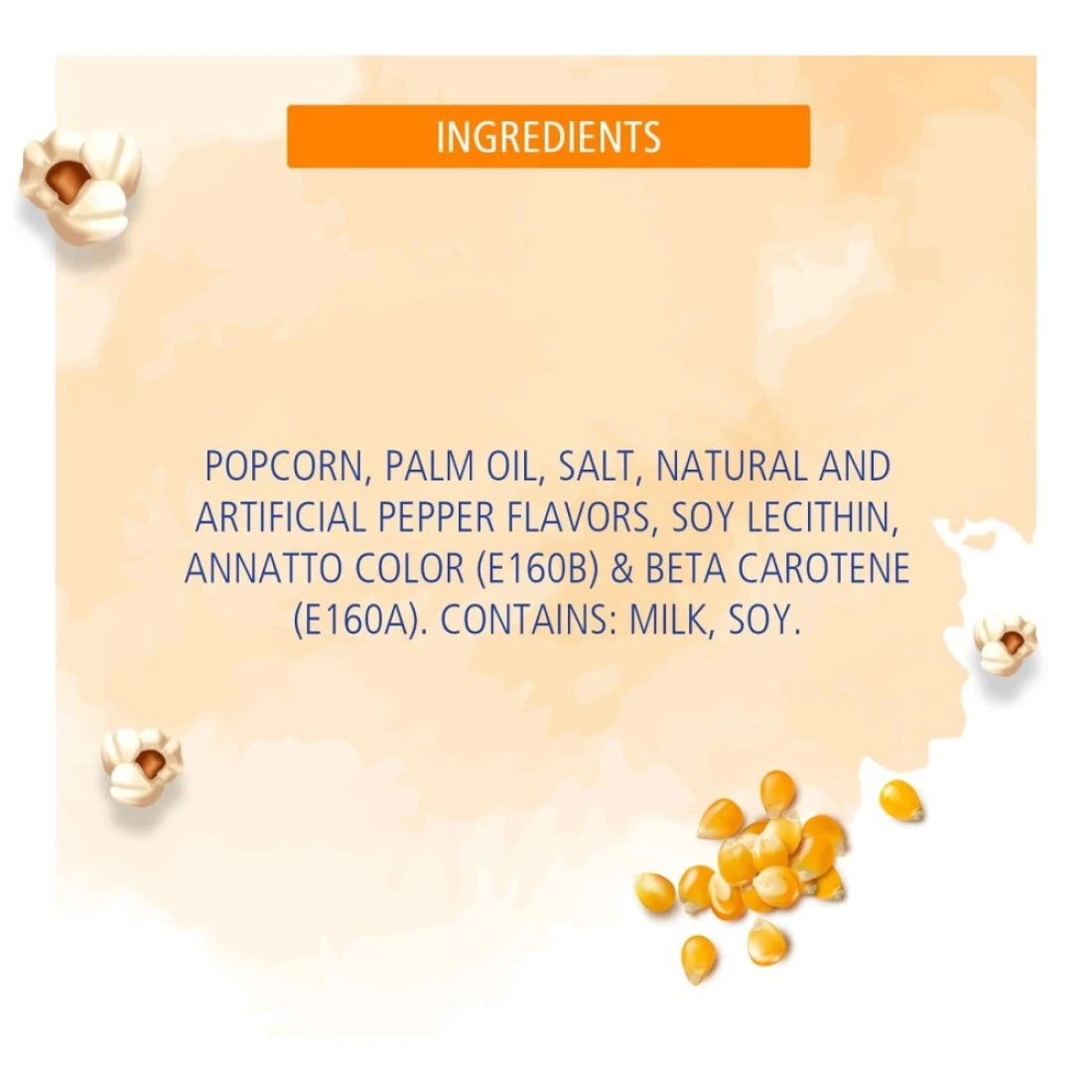 - يعد هذا الفشار الحار اللذيذ مصدرًا جيدًا للألياف، وخالي من الغلوتين، ونباتي، ولا يحتوي على أي دهون متحولة أو كوليسترول، ولا يحتوي على ألوان صناعية أو مواد حافظة.