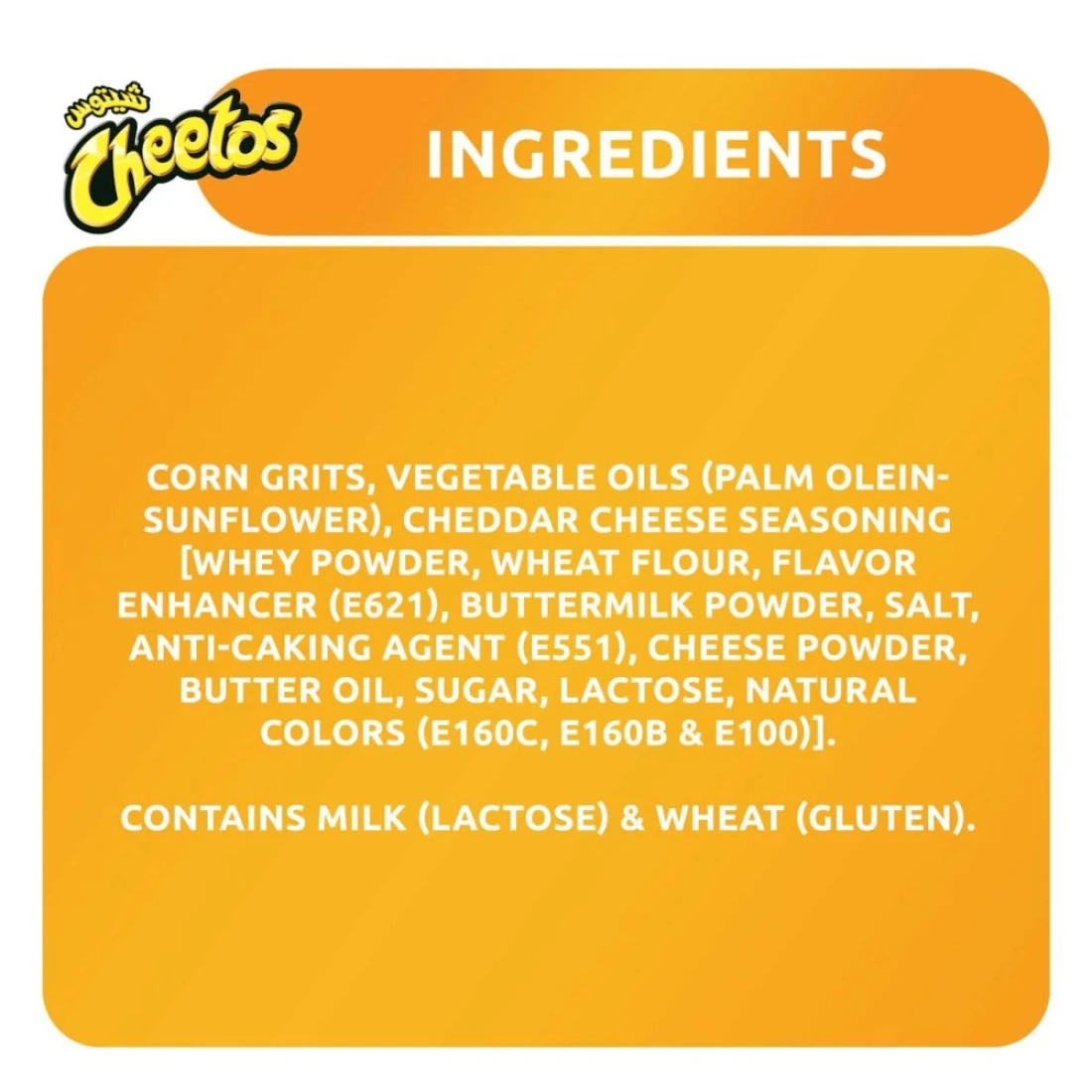 ingredients : فريك الذرة الزيوت النباتية أولين النخيل عباد الشمس الفلفل الحار نكهة طبيعية مسحوق خميرة ملح دقيق الأرز سكر محلل بروتين نباتي معززات النكهة e621 وe635 منظم الحموضة e330 وe262i1 مسحوق مصل اللبن لون طبيعي e160c عامل مضاد للتكتل e552 مسحوق الجبن مسحوق البصل مسحوق الثوم مسحوق اللبن يحتوي على الحليب اللاكتوز الصويا الغلوتين القمح