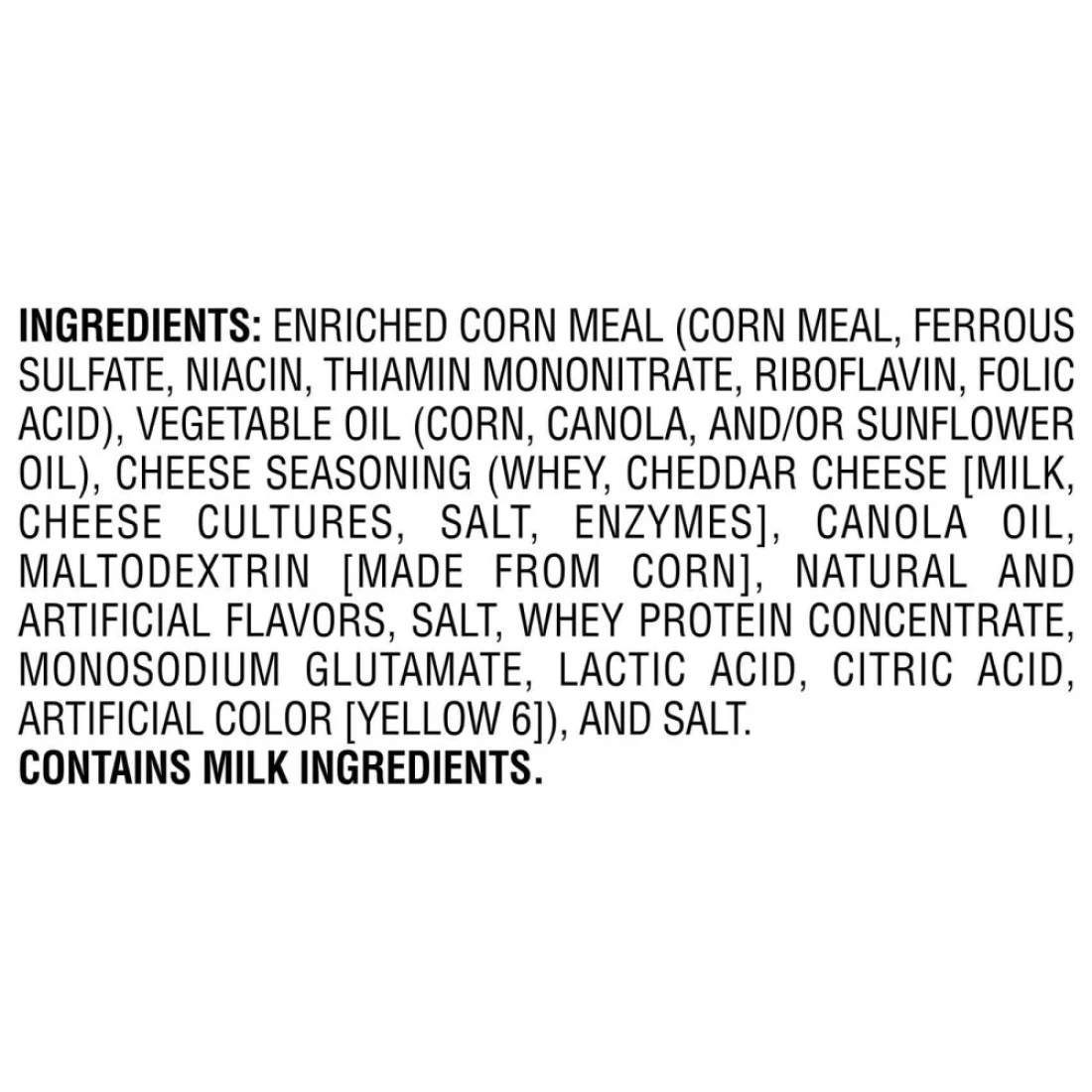 ingredients : دقيق ذرة مدعم (دقيق ذرة، كبريتات الحديد، النياسين، ثيامين مونونترات، ريبوفلافين، وحمض الفوليك)، زيت نباتي (يحتوي على واحد أو أكثر من الزيوت التالية: زيت الذرة، زيت الصويا، أو زيت عباد الشمس)، مصل اللبن، ملح، جبن شيدر (حليب، مستنبتات الجبن، ملح، إنزيمات)، وأقل من 2% من المكونات التالية: زيت صويا مهدرج جزئيًا، مالتوديكسترين، فوسفات ثنائي الصوديوم، كريمة حامضية (كريمة مستنبتة، حليب خالي الدسم)، نكهة صناعية، جلوتامات أحادي الصوديوم، حمض اللاكتيك، لون صناعي (يشمل الأصفر 6) وحمض الستريك.