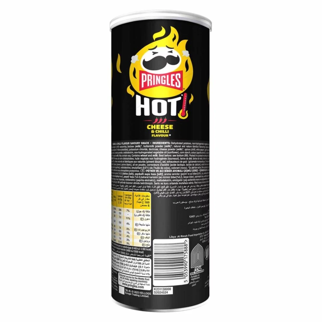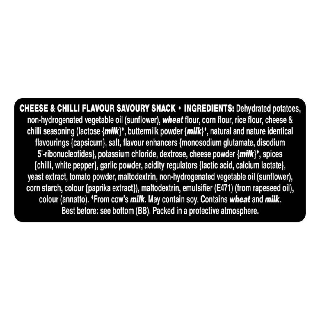 ingredients : البطاطا المجففة ، الزيت النباتي غير المهدرج (عباد الشمس) ، دقيق القمح ، دقيق الذرة ، دقيق الأرز ، الجبن وتوابل الفلفل الحار (اللاكتوز {الحليب} ، مسحوق اللبن الرائب {الحليب} ، النكهات الطبيعية والطبيعة المتطابقة {الفليفلة} ، الملح ، محسنات النكهة {الغلوتامات أحادية الصوديوم ، ثنائي الصوديوم 5'-الريبونوكليوتيدات} ، كلوريد البوتاسيوم ، سكر العنب ، مسحوق الجبن {الحليب} ، التوابل {الفلفل الحار ، الفلفل الأبيض} ، مسحوق الثوم ، منظمات الحموضة {حمض اللاكتيك ، لاكتات الكالسيوم} ، مستخلص الخميرة ، مسحوق الطماطم ، مالتوديكسترين ، زيت نباتي غير مهدرج (عباد الشمس) ، نشا الذرة ، اللون {مستخلص الفلفل الحلو}) ، مالتوديكسترين ، مستحلب (E471) (من زيت بذور اللفت) ، اللون (أناتو). من حليب البقر