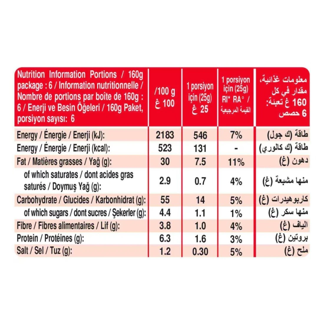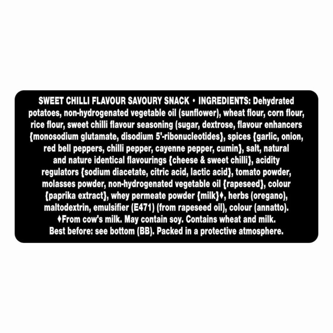 ingredients : بطاطس مجففة ، زيت نباتي غير مهدرج (عباد الشمس) ، دقيق القمح ، دقيق الذرة ، دقيق الأرز ، توابل نكهة الفلفل الحلو (سكر ، سكر العنب ، محسنات النكهة {غلوتامات أحادية الصوديوم ، ثنائي الصوديوم 5'-ريبونوكليوتيدات} ، بهارات (ثوم ، بصل ، فلفل أحمر ، فلفل حار ، فلفل حريف ، كمون} ، ملح ، نكهات طبيعية وطبيعية متطابقة {الجبن والفلفل الحلو} ، منظمات الحموضة {ثنائي أسيتات الصوديوم ، حامض الستريك ، حمض اللاكتيك} ، مسحوق الطماطم ، مسحوق دبس السكر ، زيت نباتي غير مهدرج {بذور اللفت} ، لون {مستخلص الفلفل الحلو} ، مسحوق مصل اللبن (الحليب} ، الأعشاب (الأوريغانو) ، مالتوديكسترين ، مستحلب (E471) (من زيت بذور اللفت) ، اللون (أناتو). من حليب البقر