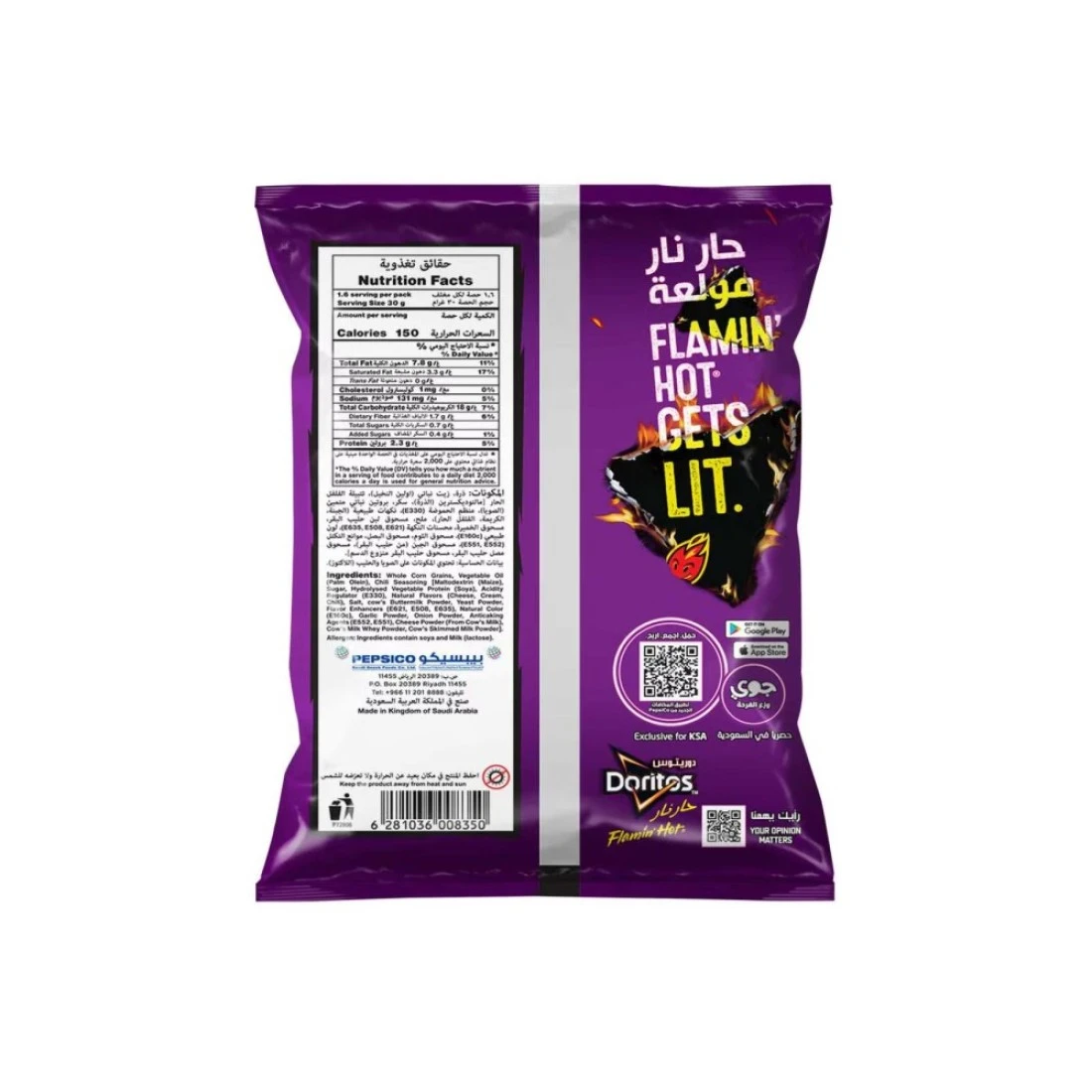 هل تبحث عن وجبة خفيفة لا تقاوم؟ ينتهي بحثك هنا. رقائق التورتيلا بنكهة فلامن هوت من دوريتوس هي وجبة خفيفة جريئة وحارة تجمع بين القرمشة المميزة لرقائق التورتيلا مع توابل فلامن هوت الحارة. تقدم لك مزيجًا مكثفًا من التوابل الحارة ونكهة جبن الناتشو الكلاسيكية، مما يخلق تجربة مضغ جريئة لا تُنسى. مصنوعة من الذرة عالية الجودة، تقدم وجبات التورتيلا الخفيفة هذه قرمشة إدمانية وركلة حارة لبراعم التذوق لديك. تصبح كل قضمة مغامرة مثيرة، متبلة بمزيج من التوابل، لتمنحك حرارة شديدة ونكهة في نفس الوقت. يمكنك تجربة الوجبة الخفيفة بمفردها أو تجربة غمسها في صلصة السالسا أو الجبن المفضلة لديك، للحصول على نكهة فلامن هوت التي لا تقاوم تنبثق من كل قضمة جبن. العبوة التي يبلغ وزنها 48 غرامًا هي وجبة خفيفة مثالية أثناء التنقل؛ في العمل أو في رحلة برية أو لخلق ذكريات مع أصدقائك كل مساء. تُغطى الرقائق بتوابل "فلمين هوت" الحارة واللاذعة التي توفر نكهة حارة، في حين يضيف الملمس المقرمش الكلاسيكي لدوريتوس نكهة مرضية.
