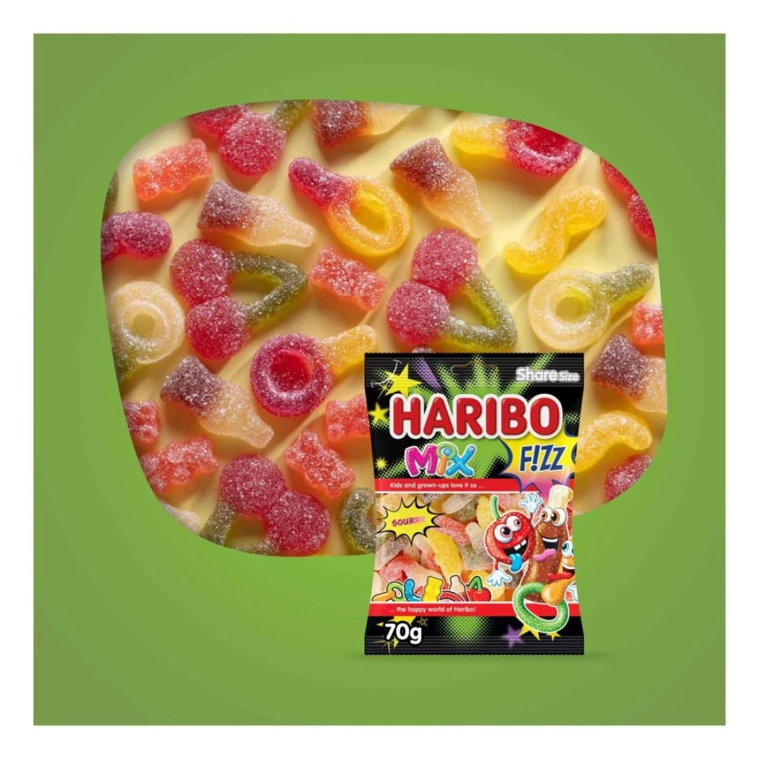 - يحتوي كيس هاريبو ميكس فيز على مزيج من الحلوى الحلال الحلوة والحامضة بشكل زجاجة كلاسيكية رائعة للمشاركة أو تناول الوجبات الخفيفة أو تزيين الآيس كريم