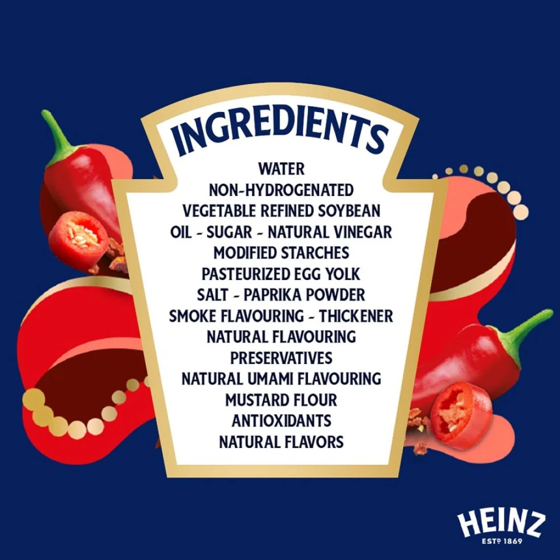 ingredients : ماء، غير مهدرج، زيت فول صويا نباتي مكرر، سكر، نشاء معدل بالخل الطبيعي، صفار البيض المبستر، ملح، مسحوق البابريكا، نكهة الدخان، نكهة طبيعية مكثفة، مواد حافظة، نكهة أومامي طبيعية، م كسترد، دقيق، مضادات الأكسدة، نكهات طبيعية