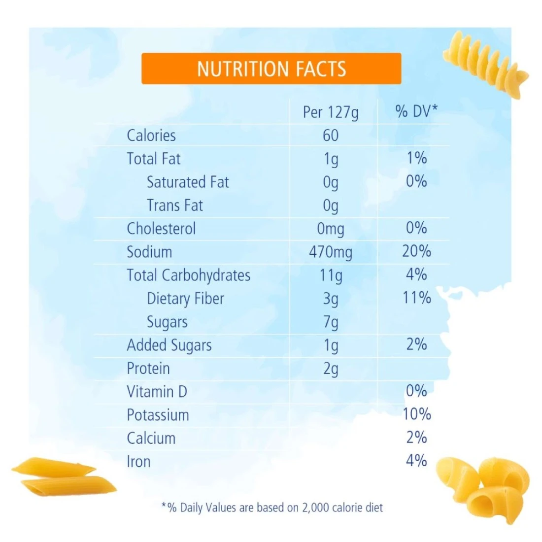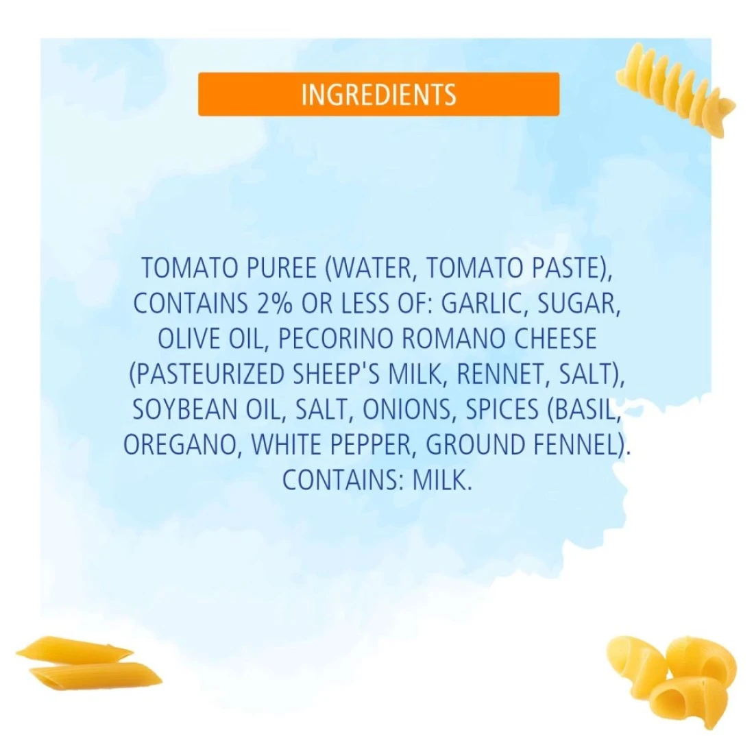 ingredients : معجون طماطم (ماء، معجون طماطم)، يحتوي على 2% أو أقل من: ثوم، سكر، زيت زيتون، جبنة بيكورينو رومانو (حليب غنم مبستر، منفحة، ملح)، زيت فول الصويا، ملح، بصل، بهارات (ريحان، أوريغانو، أبيض) الفلفل، الشمر المطحون).