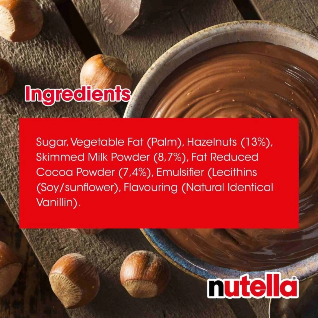 ingredients : سكر ، زيت نخيل ، بندق 13٪ ، مسحوق حليب منزوع الدسم 8.7٪ ، كاكاو قليل الدهن 7.4٪ ، مستحلبات: ليسيثين [فول الصويا] فانيلين