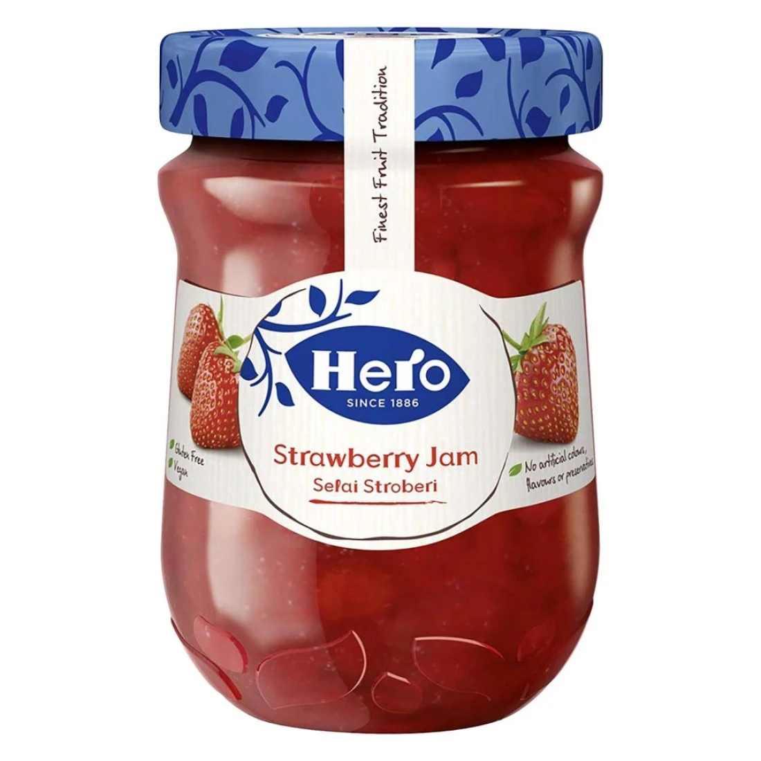 هيرو مربى فراولة 350 غرام، عبارة عن مزيج لذيذ من الفراولة الحلوة والنكهات المنعشة لإضافة عمق رائع من النكهة إلى فطيرة التوست الصباحية أو وصفات الإفطار. المربى الجاهز للإستخدام مصنوع من أجود مكونات الفاكهة ولم تتم إضافة أي ألوان صناعية أو نكهات أو مواد حافظة إلى هذا المنتج الشهير. استمتع بطعم الفراولة المعبأة بالمربى.