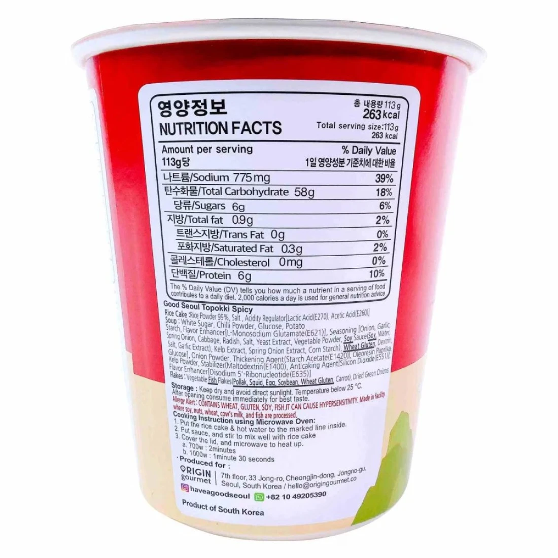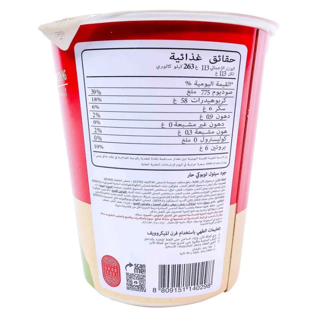 ingredients : مسحوق الأرز 99%، ملح، مُنظم الحموضة [حمض اللبنيك (E270)، حمض الخل (E260)]. الحساء: سكر أبيض، مسحوق الفلفل الحار، جلوكوز، نشاء البطاطا، مُحسِّن النكهة [جلوتامات الصوديوم (E621)]، توابل [بصل، ثوم، بصل أخضر، كرنب، فجل، ملح، مستخلص خميرة، مسحوق الخضار، صلصة الصويا (صويا، ماء، ملح، مستخلص الثوم)، مستخلص الكليب، مستخلص بصل أخضر، نشا الذرة، جلوتين القمح، دكسترين، جلوكوز)، مسحوق البصل، عامل تكثيف [أسيتات النشاء (E1420)]، بابريكا حلوة، مسحوق الكليب، مُثبت (مالتودكسترين (E1400)، مُضاد للتكتل [ثاني أكسيد السيليكون (E551)]، مُحسِّن النكهة [النوكليوتيدات الريبونيوكليزية الثنائية الصوديوم (E635)]، رقائق: رقائق الخضار والأسماك (سمك البولوك، حبار، بيض، فول الصويا، جلوتين القمح، جزر)، بصل أخضر مجفف.