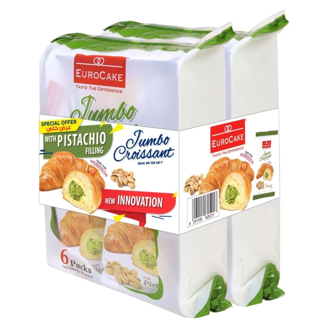 استمتع بتناول كرواسون يوروكيك جامبو بحشوة الفستق، وهي وجبة شهية تجمع بين الرقائق الزبدية للكرواسون وحشوة الفستق الغنية. تحتوي هذه العبوة على قطعتين بوزن 300 غرام لكل منهما، وهي مثالية للاستمتاع بها كوجبة خفيفة أو حلوى.