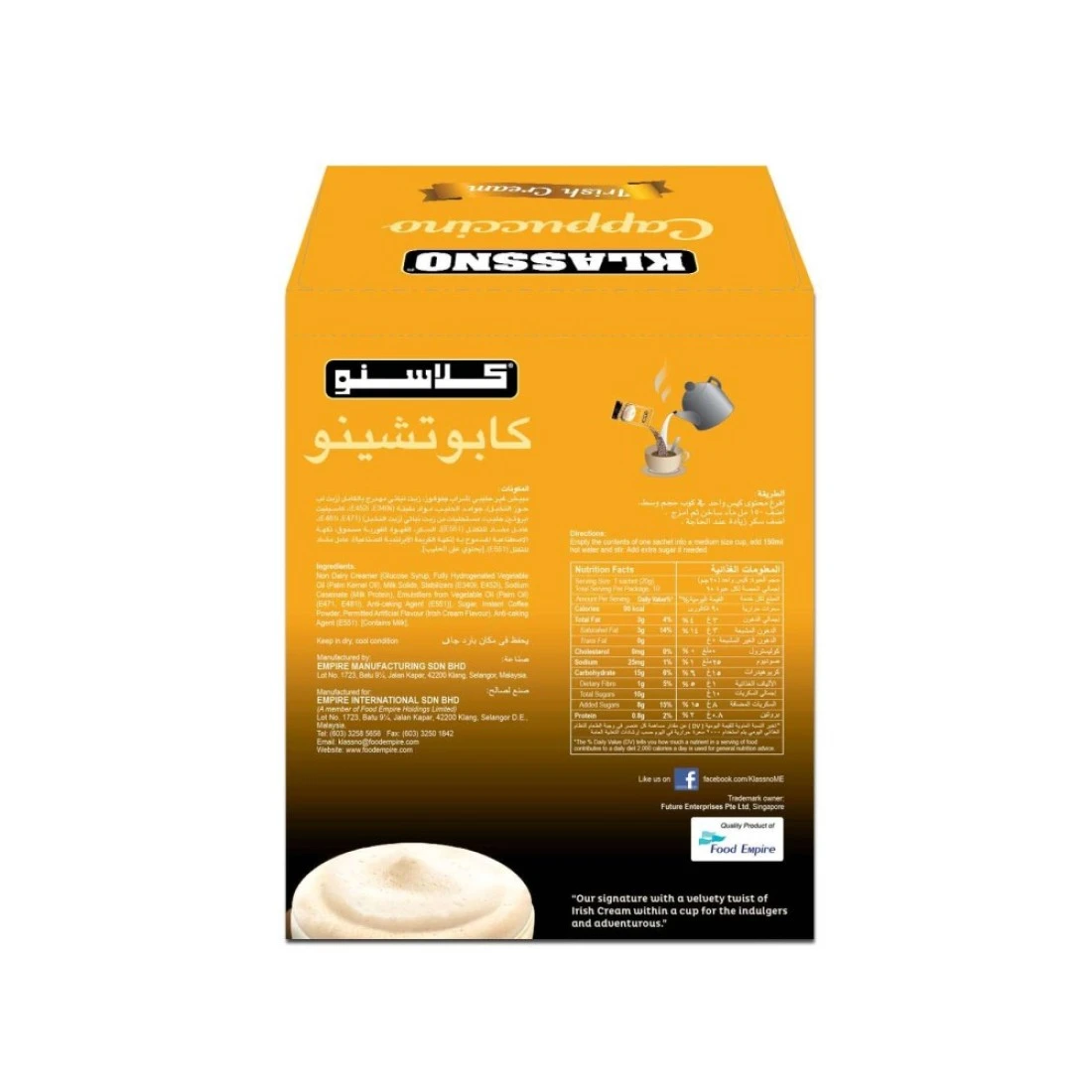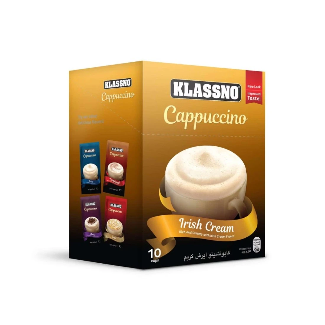 - تضيف حزمة كلاسنو مسحوق كابوتشينو سريع التحضير مع نكهة الكريمة الإيرلندية اللمسة الأخيرة إلى فنجان القهوة اللذيذ والمغري li>