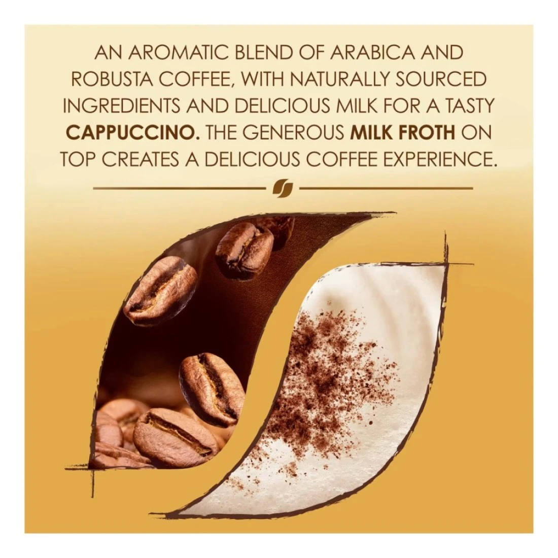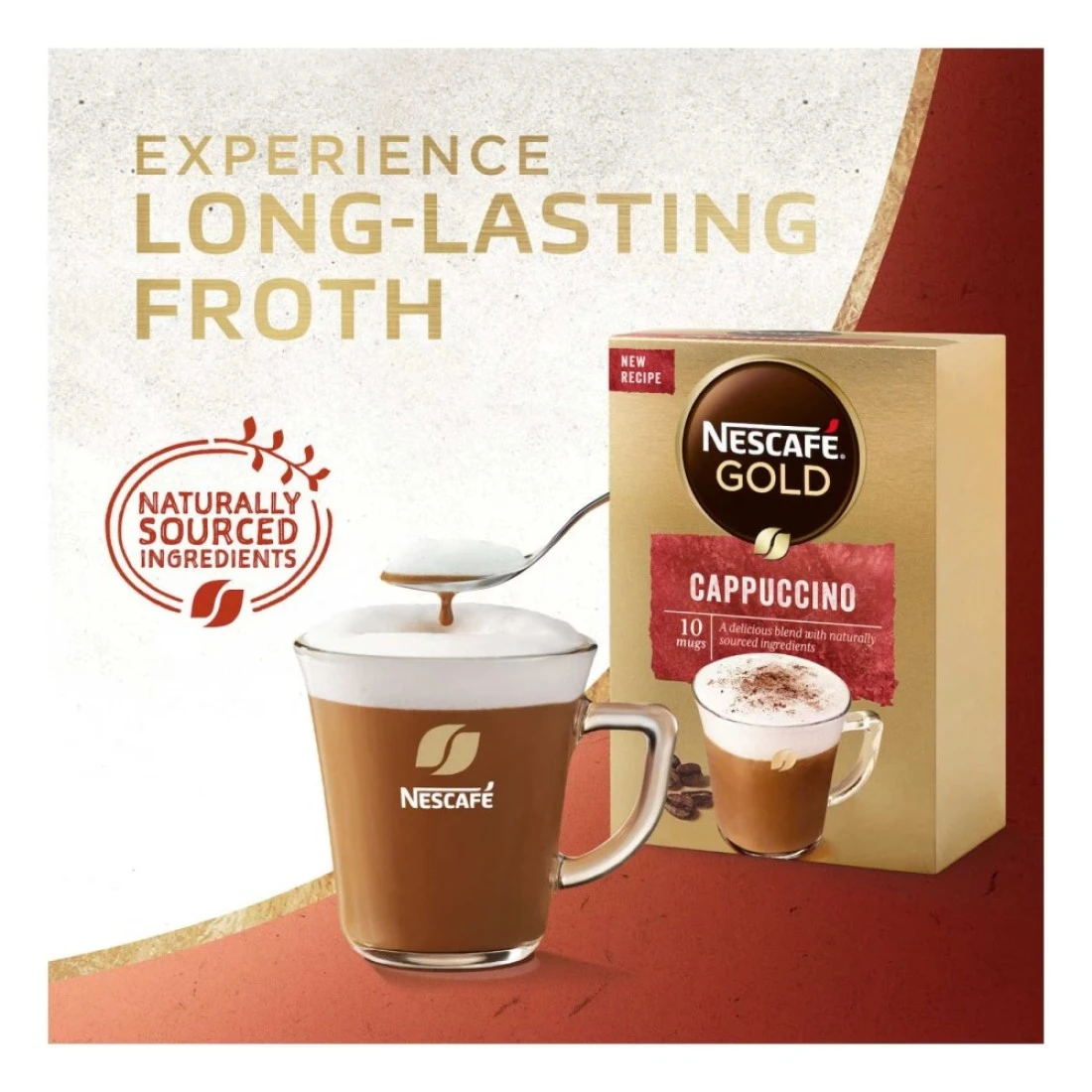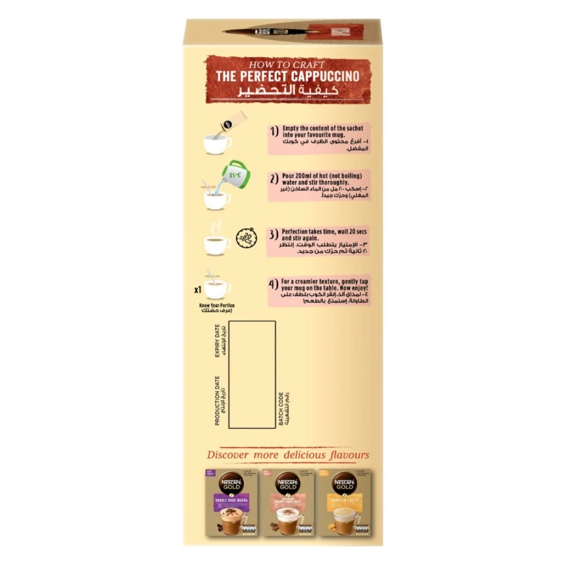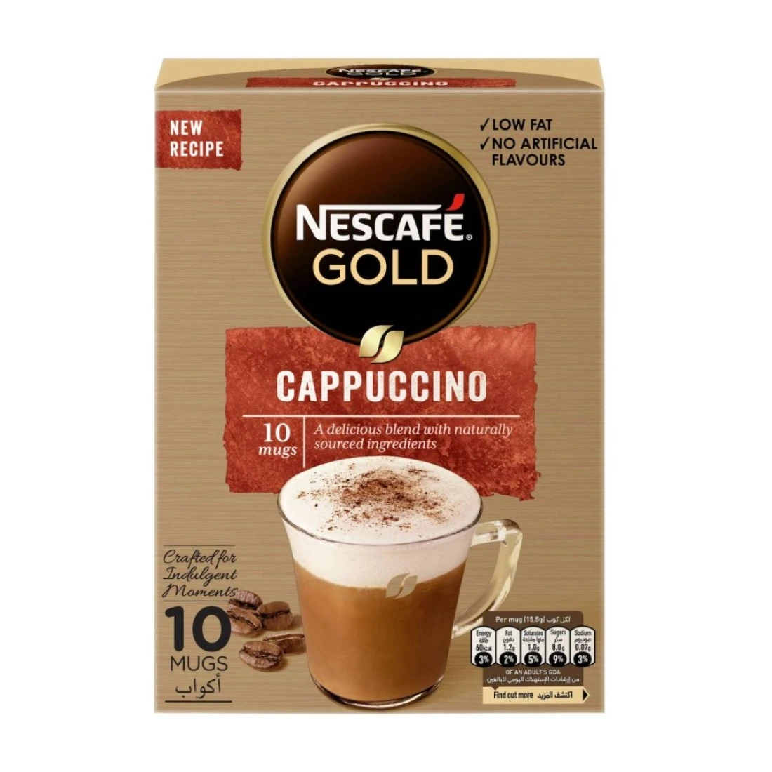 - جودة ممتازة: كابتشينو نسكافيه الذهبي مصنوع من حبوب البن عالية الجودة، مما يضمن نكهة غنية وعطرية في كل كوب