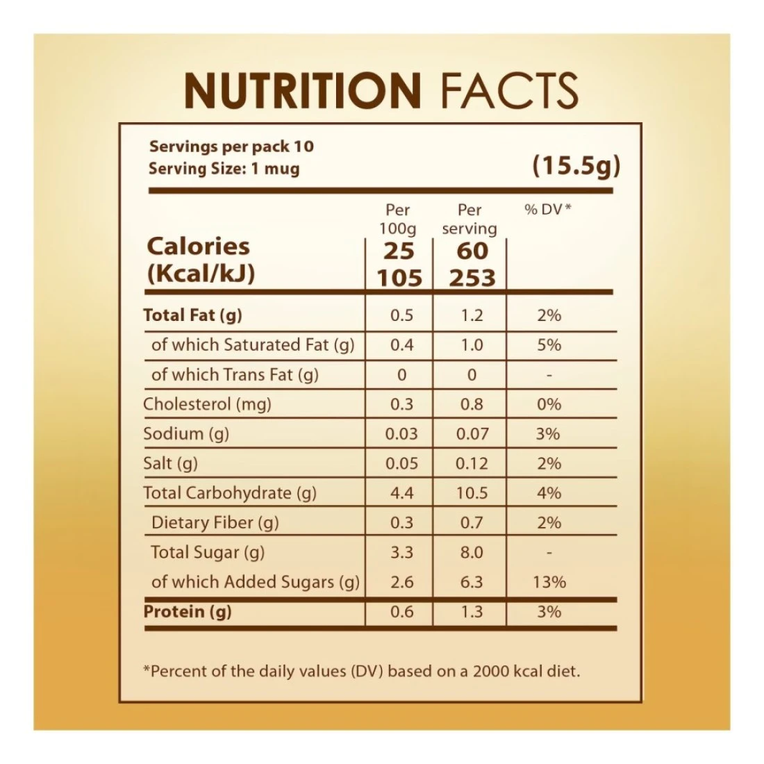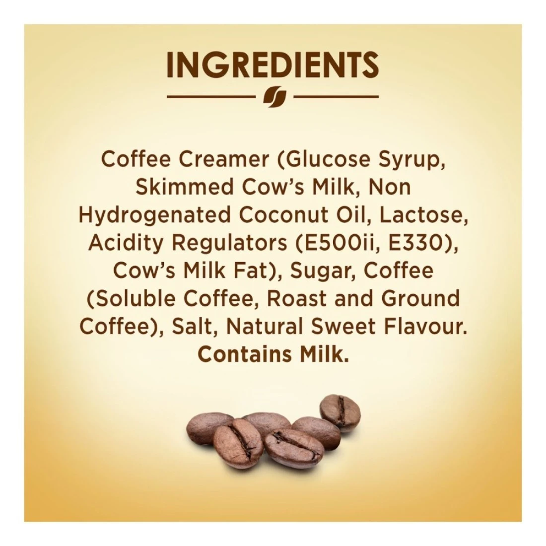 ingredients : سكر، مسحوق حليب البقر منزوع الدسم، قهوة سريعة الذوبان، شراب الغلوكوز، نشا (ذرة، قمح)، زيت غير مهدرج (زيت جوز الهند) لاكتوز، قهوة محمصة، ملح، منظم الحموضة: E340II، المثبتات: (E452I، E331Iii)،, دهون الحليب