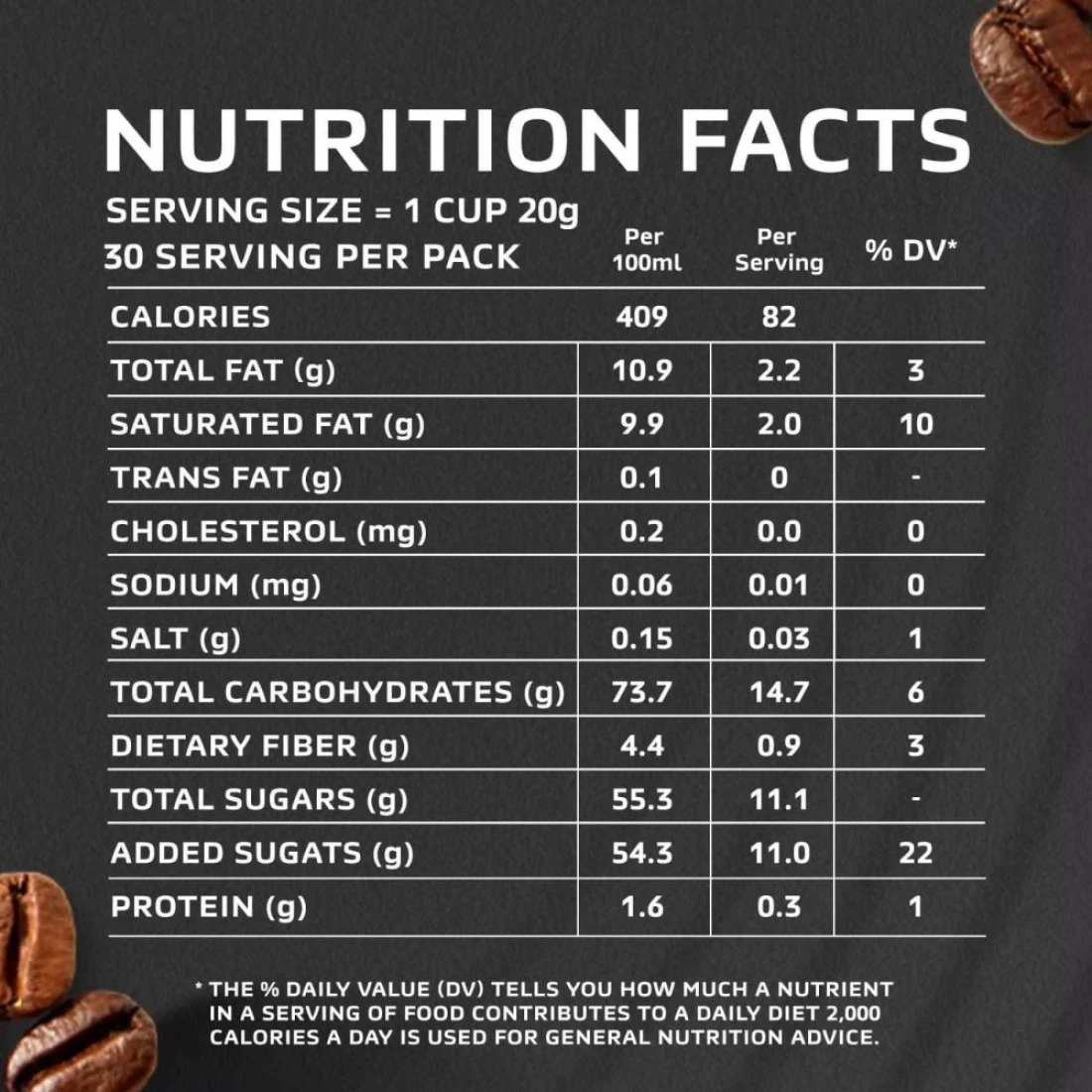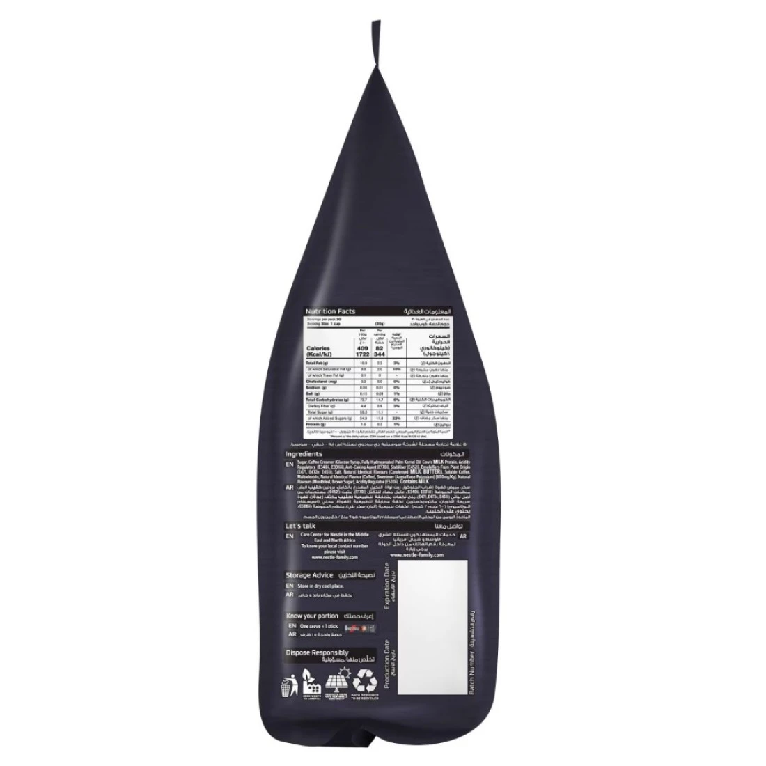 ingredients : سكر، مقشدة القهوة: (شراب الغلوكوز، زيت نواة النخيل المهدرج، كازينات الصوديوم (بروتين الحليب)، منظمات الحموضة: (E340II، E331Iii)، مثبتات من أصل اصطناعي (E452I، E451I)، مستحلبات من أصل نباتي (E471، E472E)، عامل مضاد للتكتل (E551)، ملح، نكهات ألبان طبيعية متطابقة)، مسحوق قهوة سريع الذوبان، مالتوديكسترين، نكهات طبيعية متطابقة (منتجات الألبان، السكر البني، القهوة)، محلي (أسيسولفام K 600 ملغ/كغ)، منظم الحموضة (E500)