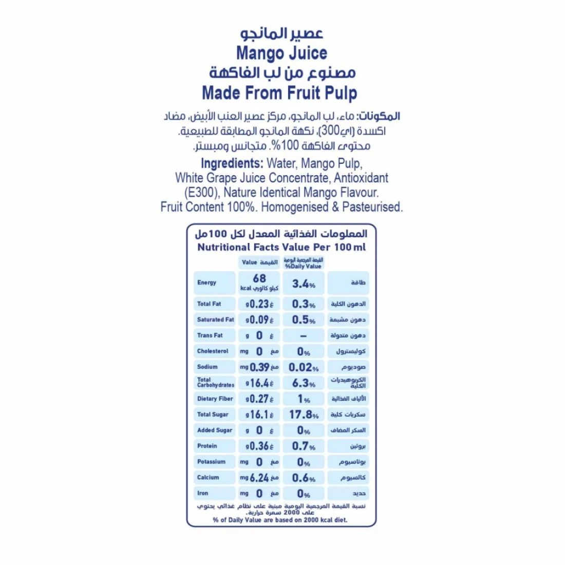 ingredients : ماء، لب المانغو (16%)، سكر، حامض الستريك، حامض الاسكوربيك (فيتامين C).