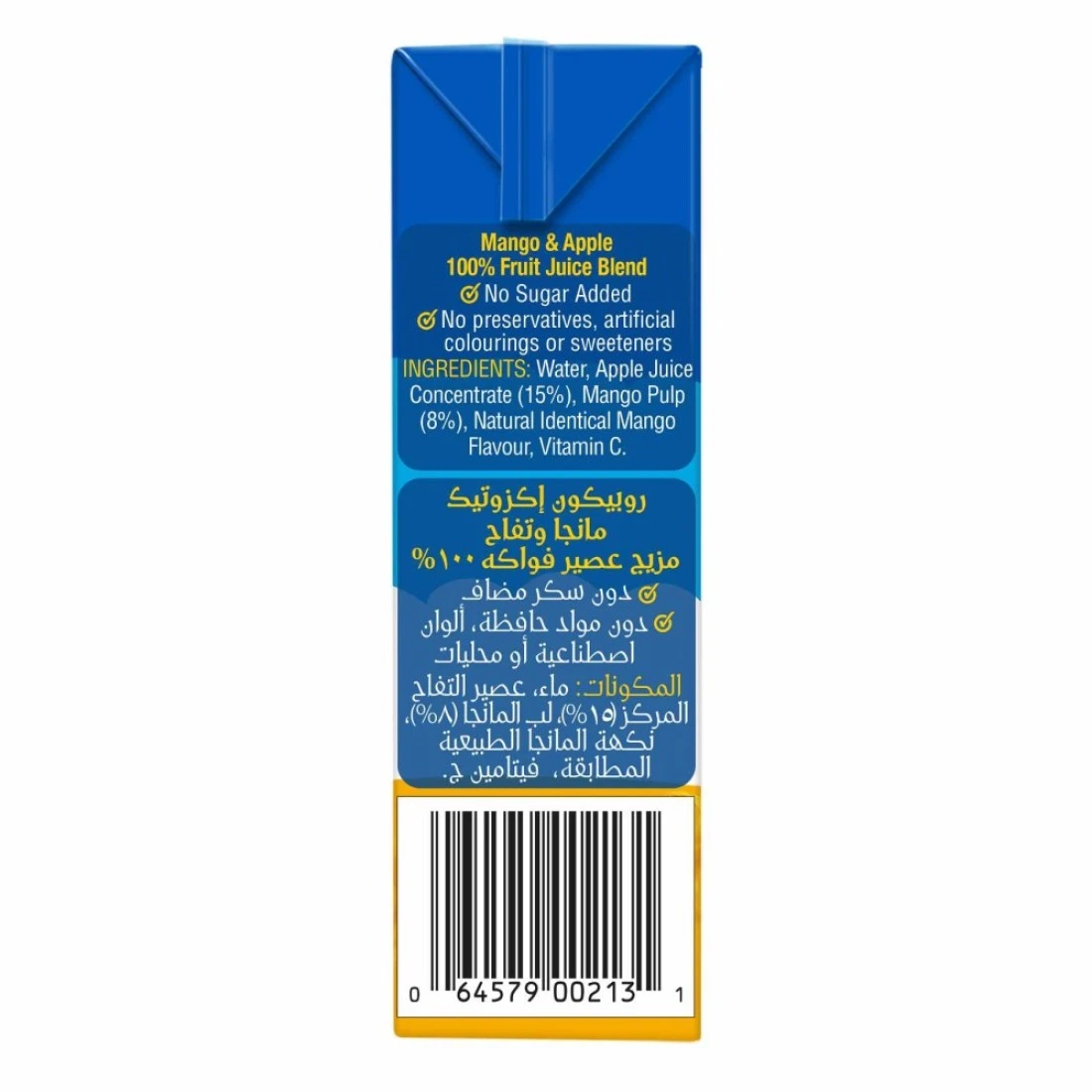 ingredients : ماء، لب المانغو، عصير التفاح المركز، نكهات طبيعية وصناعية، فيتامين C.