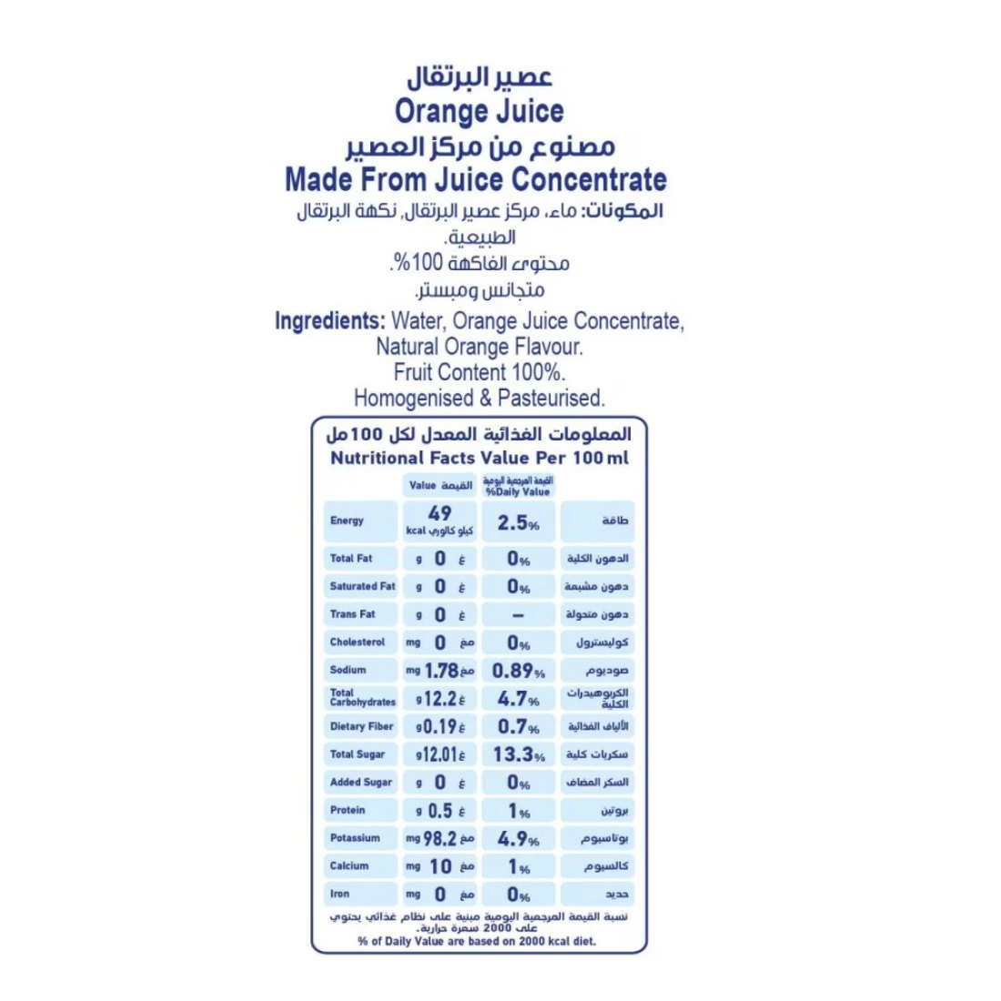 ingredients : ماء، عصير برتقال مركز، فيتامين C