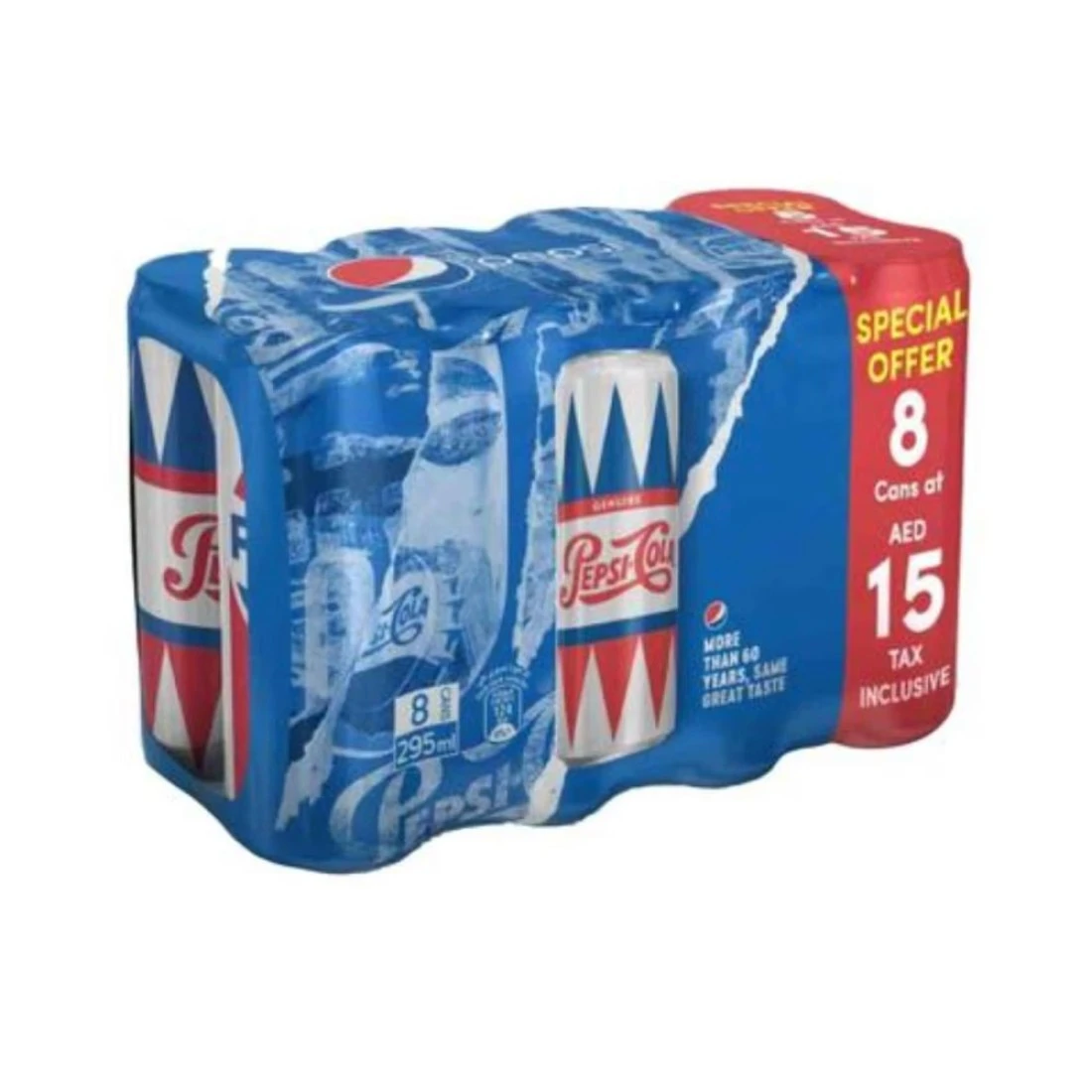 - يتوفر الآن في علب أنيقة ومناسبة، تحتوي كل علبة على 295 ملل من مشروبك المفضل في حزمة مكونة من 8 علب خفيفة الوزن ومريحة، من السهل حمل علب بيبسي العصرية أثناء التنقل.