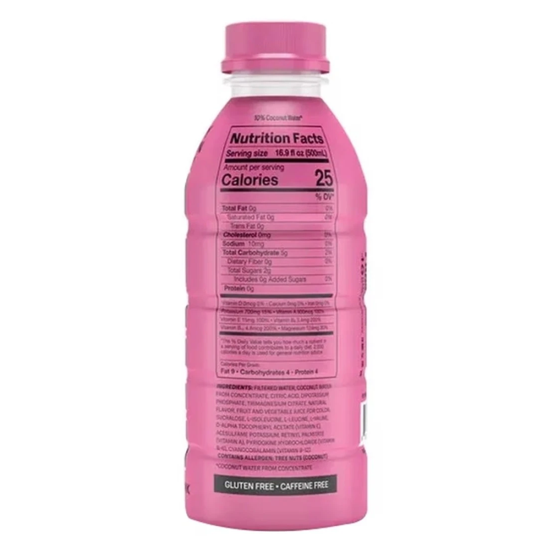 ingredients : ماء ، حمض (حامض الستريك) ، مسحوق ماء جوز الهند المعاد تشكيله (10.5٪) ، ملح معدني (فوسفات البوتاسيوم) ، نكهة ، لون (بطاطا حلوة ، مركز الكرز والجزر الأسود) ، محليات (سوكرالوسي ، أسيسولفام ك) ، أحماض أمينية (ل-آيسولوسين ، ل-ليوسين ، ل-فالين) ، مثبتات (صمغ السنط) ، استرات الغلسرين من الصنوبري الخشبي) ، فيتامين E ، فيتامين B 6 ، فيتامين B 12