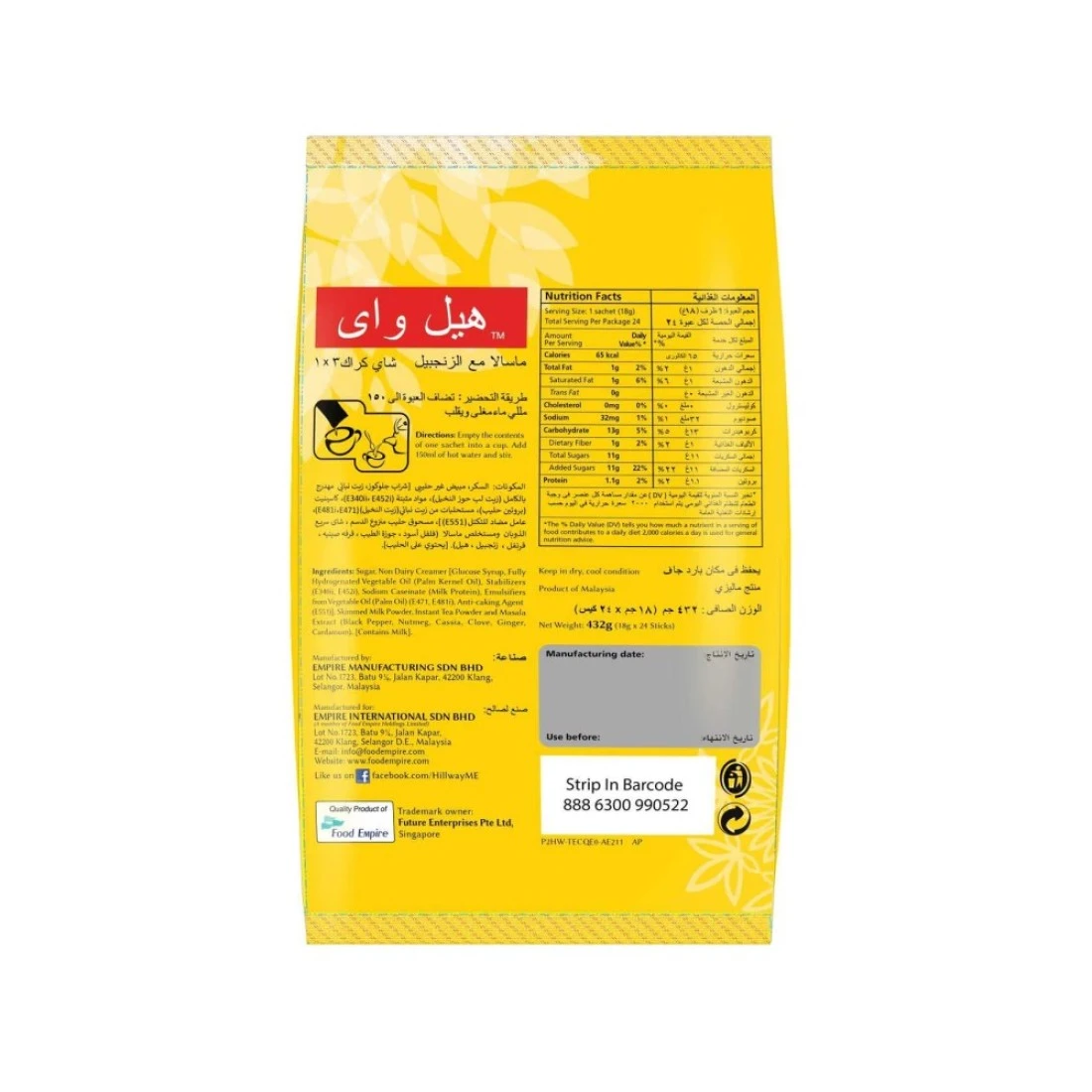 هيلواي كرك ماسالا 3 في 1 شاي بالتوابل والزنجبيل 20 كيس، هو شاي يحتوي على مزيج لذيذ ومنعش من بهارات الماسالا التقليدية مثل القرنفل والهيل والقرفة. إلى جانب نكهة الزنجبيل العطرية، سيضفي هذا الشاي رائحة محيرة حقًا على كوب الشاي الخاص بك. هذه العبوة سهلة الاستخدام وأكياس الشاي الأسود ملائمة للتخزين وتناسب نمط حياتك المزدحم. استمتع بالمذاق التقليدي اللذيذ لشاي ماسالا الأصلي مع هيلواي 3 في 1 ماسالا مع جينجر كاراك تشاي.