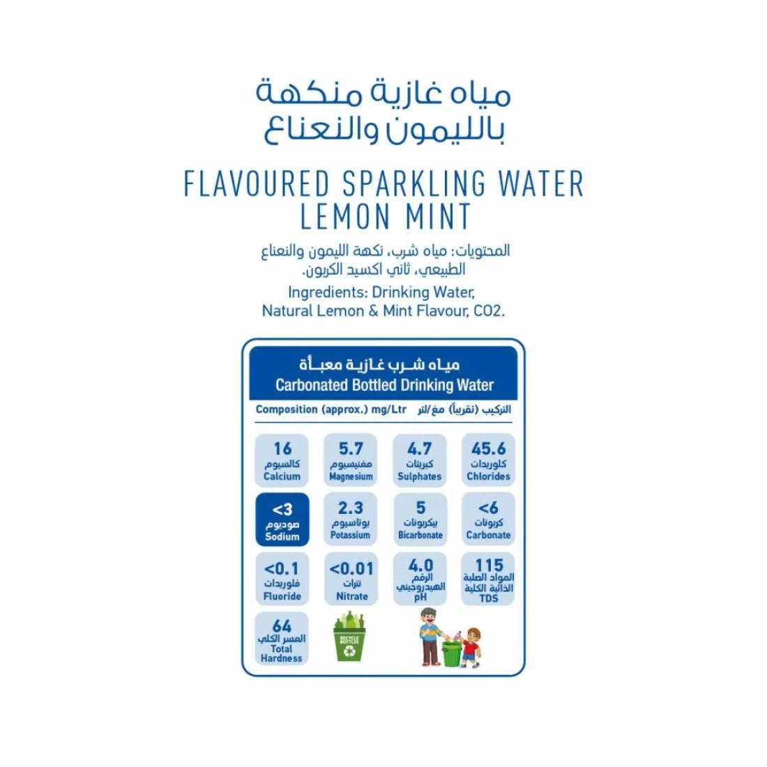 ingredients : كبريتات، بيكربونات، كالسيوم، مغنيسيوم، كلوريد، صوديوم، بقايا سيليكا، نترات، سترونتيوم، بوتاسيوم، فلورايد، درجة حموضة.