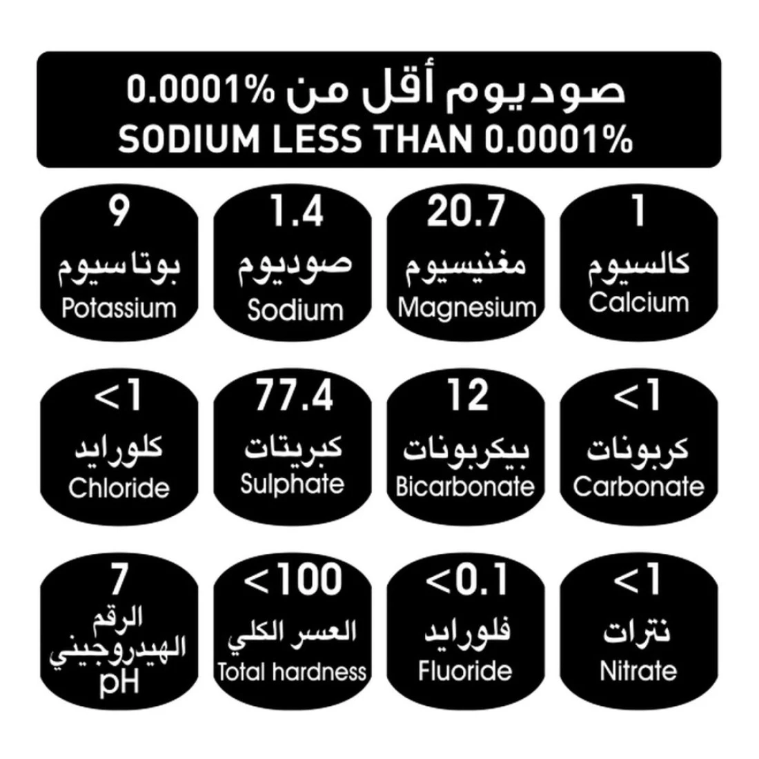 ingredients : مياه شرب معبأة 100٪. تحليل نموذجي ملغ/لتر: الكالسيوم: 1، المغنيسيوم: 20.7، الصوديوم: 1.4، البوتاسيوم: 9، الفلوريد: < 0.1، البيكربونات: 12، الكبريتات: 77.4، الكلورايد: < 1، النترات: < 1، الكربونات: < 1، الحموضة: 7، إجمالي الصلابة: أقل من 100، إجمالي المواد الصلبة المذابة: 115.