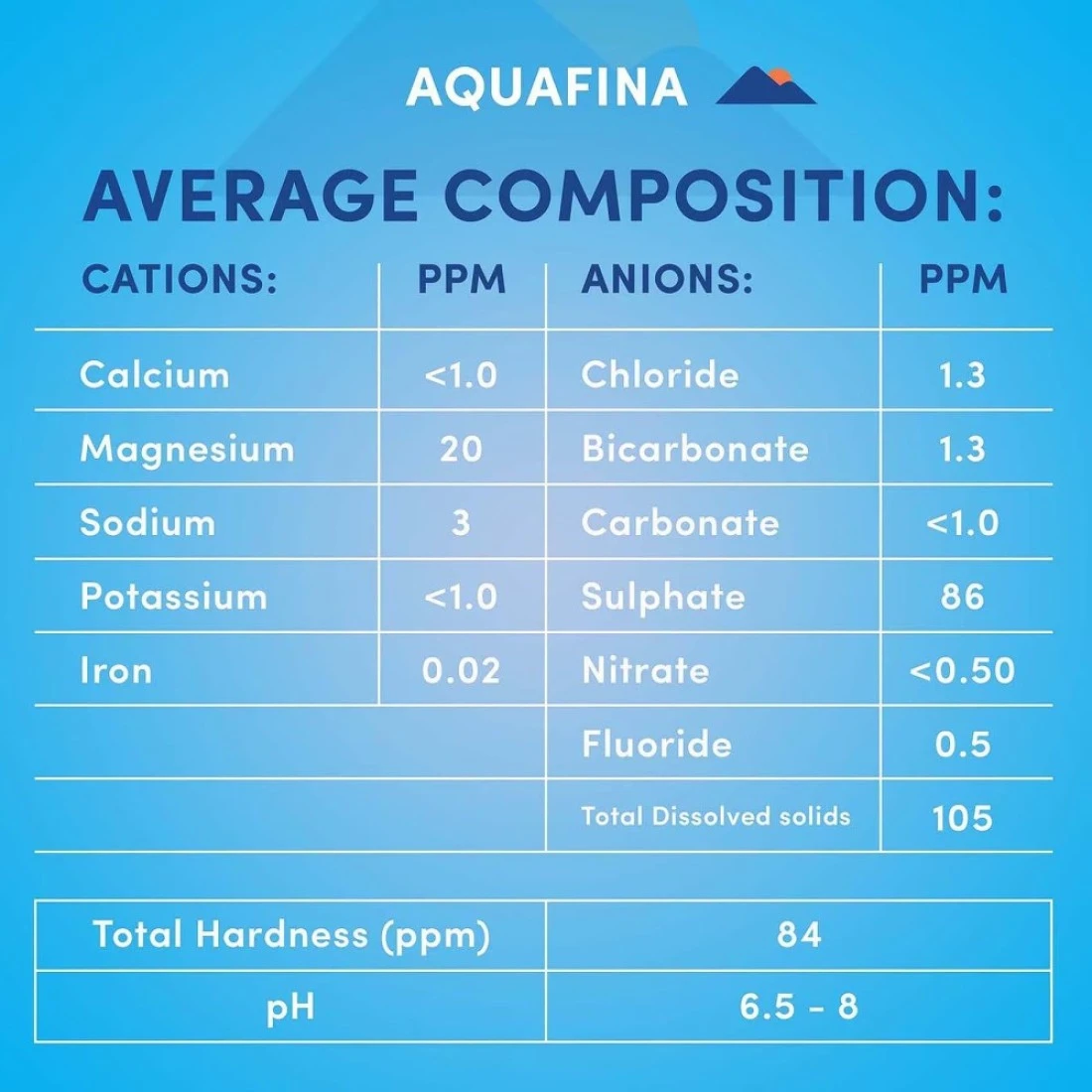 ingredients : صوديوم، بوتاسيوم، كلوريد، كالسيوم، مغنيسيوم، فلورايد، نترات، كربونات، الحموضة (pH)، بيكربونات، كبريتات.