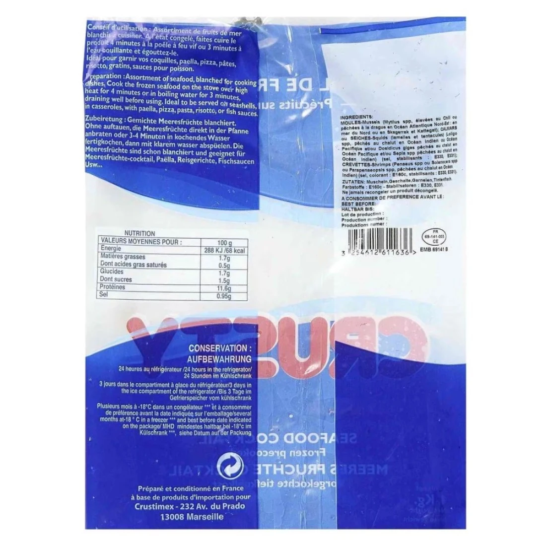 ingredients : بلح البحر (بلح البحر مستزرع في تشيلي أو مُصطاد في شمال شرق المحيط الأطلسي: في بحر الشمال أو في سكاجيراك وكاتيغات). الحبار أو السيبيا (الأذرع واللوامس) (الحبار مُصطاد بشباك الجر في المحيط الهندي أو المحيط الهادئ و/أو السيبيا مُصطادة بشباك الجر في المحيط الهندي) (ملح، مثبتات: E330، E331). الجمبري (الجمبري مُصطاد بشباك الجر في المحيط الهندي) (ملح، ملون: E160C، مثبتات: E330، E331).