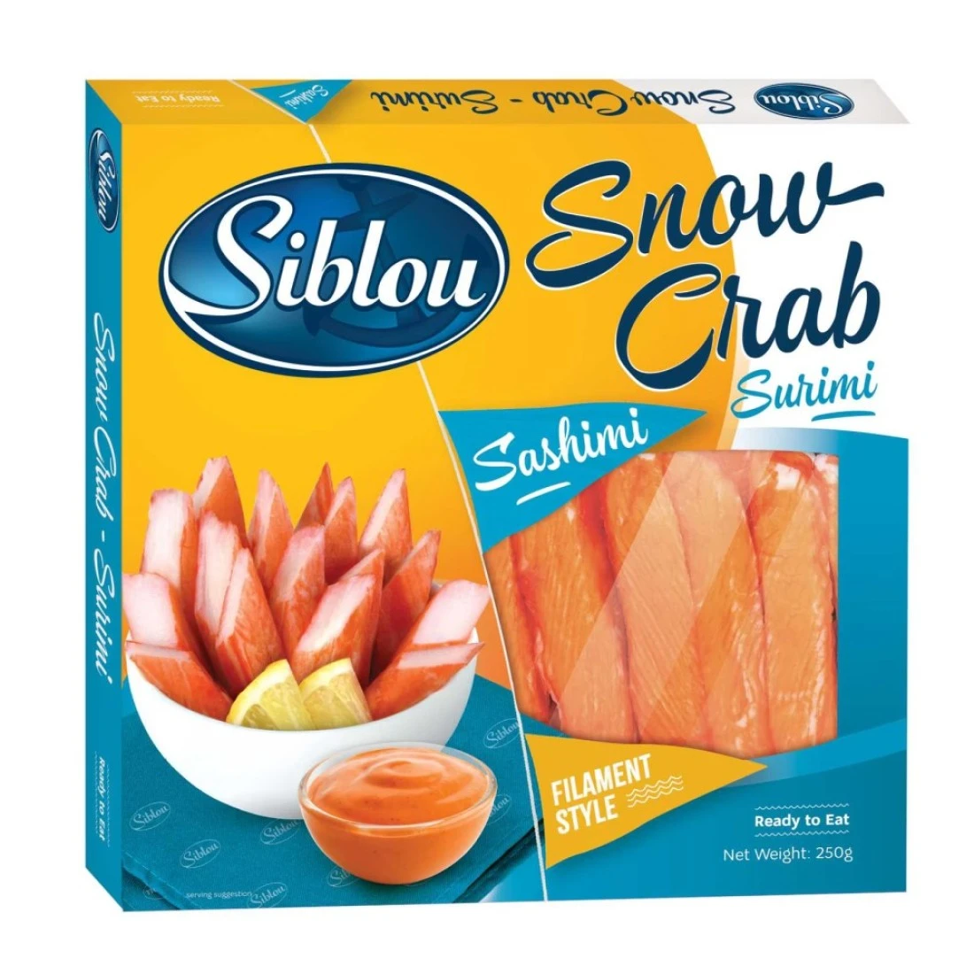 سيبلو ساشيمي سوريمي سنو أصابع السلطعون هو منتج للمأكولات البحرية لذيذ ومريح مصنوع من لحم سلطعون البحر الثلجي عالي الجودة. لقد تم تصنيعه بعناية في خيوط رفيعة وحساسة تشبه ملمس ومظهر السلطعون الحقيقي. هذا السوريمي سهل الإستخدام ويمكن الإستمتاع به في مجموعة متنوعة من الأطباق، مثل لفائف السوشي، السلطات أو كطبقة علوية لأوعية الأرز. فهو يوفر بديلاً لذيذًا وصحيًا للحم السلطعون التقليدي، وهو مثالي لمحبي المأكولات البحرية.